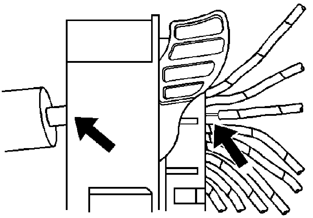 6. Insert the J 38125-21 (GM P/N 15381651-2) tool into the round canal between the terminals cavities at the front of the connector. See the release tool cross reference in the Reference Guide of the J-38125 to ensure that the correct release tool is used.