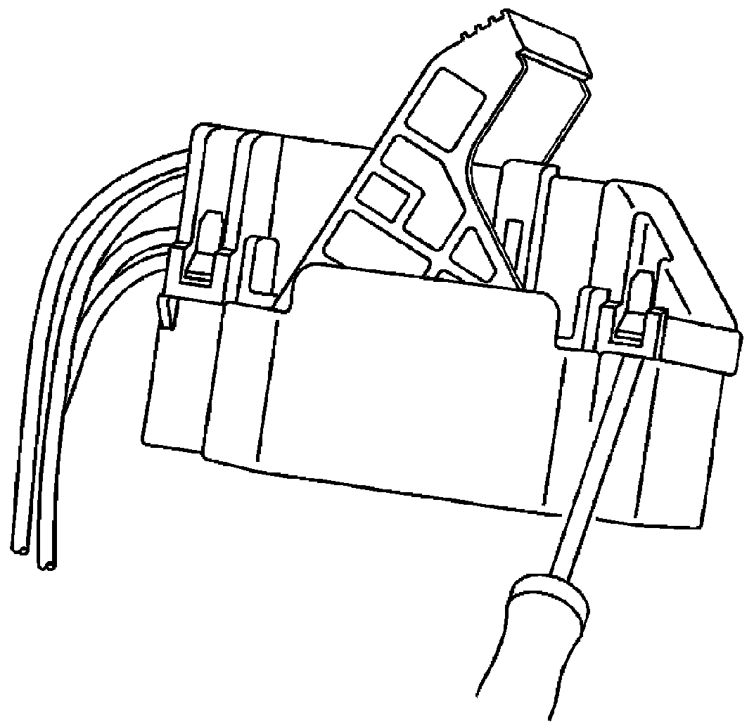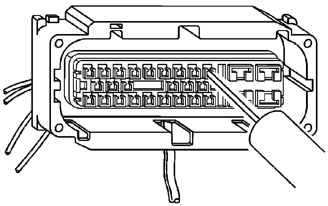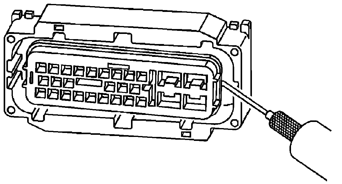 7. Insert the J-38125-553 (15315247) tool into the entry canal and pry up on the terminal retainer. The terminal retainer is a small plastic piece on the top of the terminal. The terminal retainer must be held up while the terminal is pulled out of the connector.