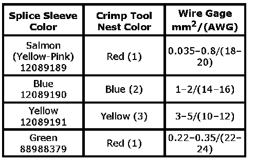 6. Select the proper DuraSeal splice sleeve according to the wire size. Refer to the above table at the beginning of the repair procedure for the color coding of the DuraSeal splice sleeves and the crimp tool nests.