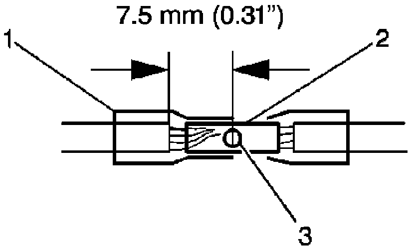 8. Place the DuraSeal splice sleeve in the nest. Ensure that the crimp falls midway between the end of the barrel and the stop. The sleeve has a stop (3) in the middle of the barrel (2) in order to prevent the wire (1) from going further. Close the hand crimper handles slightly in order to firmly hold the DuraSeal splice sleeve in the proper nest.