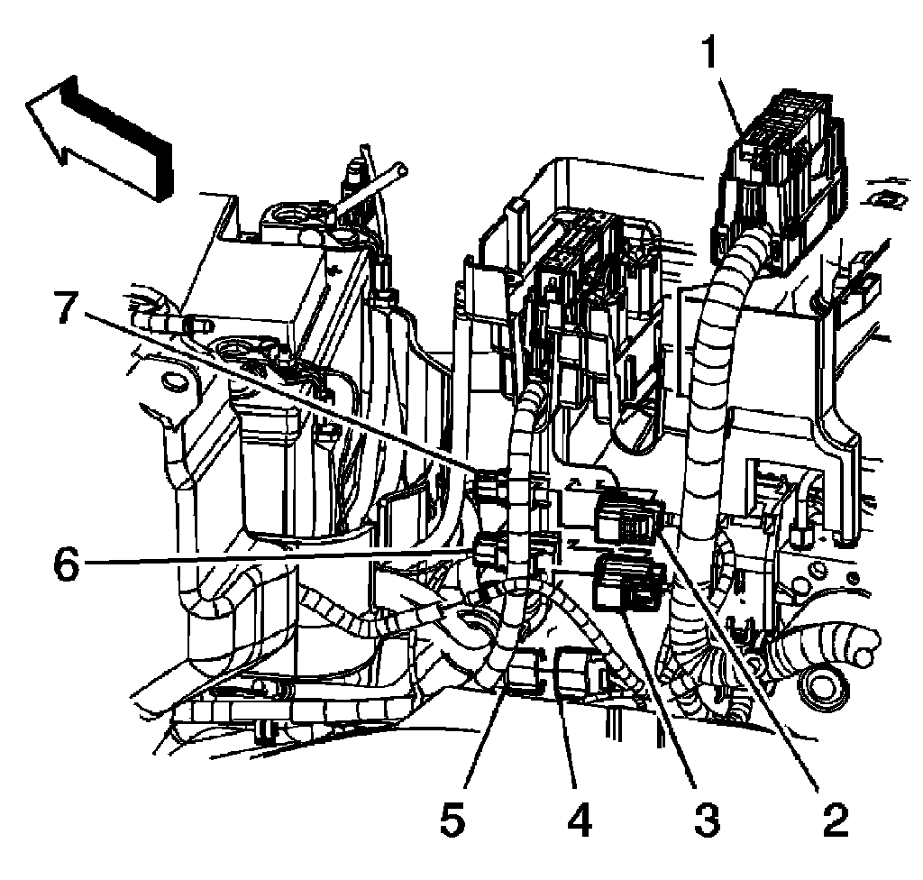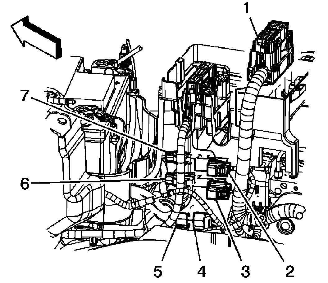 4. Disconnect the negative battery cable electrical connector (7) from the body wiring harness electrical connector (2).