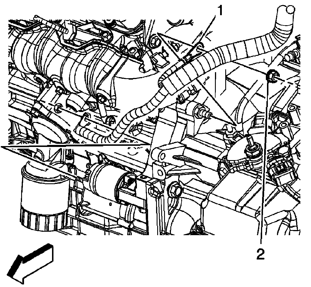 8. Remove the negative battery cable ground terminal nut (2) from the transaxle stud.