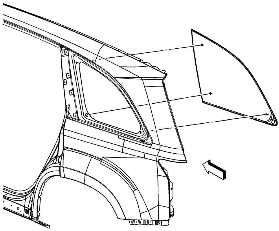 ^ Use the J 24402-A, J 39032, or equivalent in order to remove the quarter window.