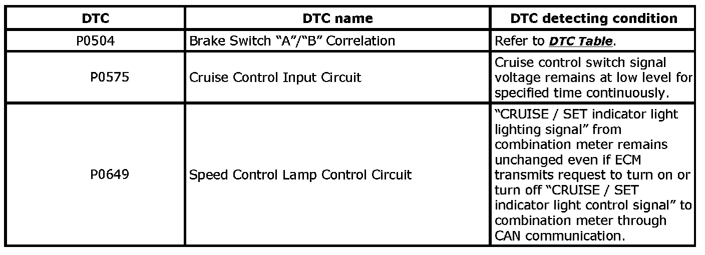 During engine running, DTC is detected by pushing cruise control switch (MAIN (ON/OFF), CANCEL, RES/ACC, or SET/COAST) for more than specified time.