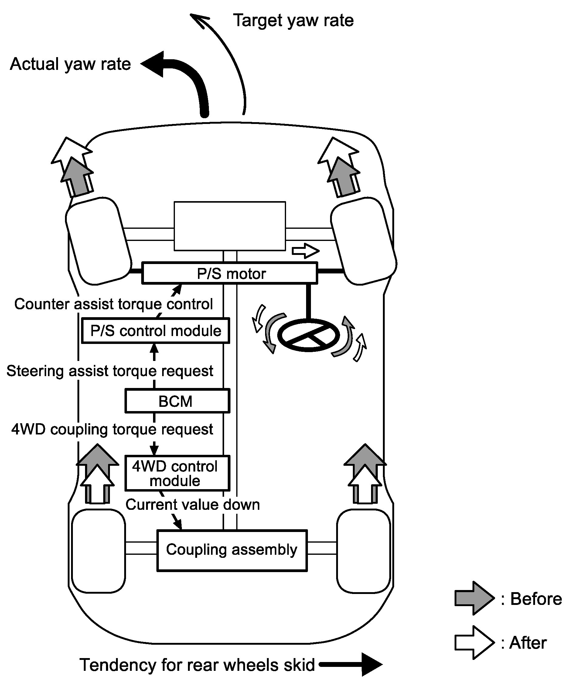 BCM sends steering assist torque request to P/S control module based on oversteering level via CAN communication, and this makes it easier for excessive steering input to be decreased by providing counter-steering assist torque to steering system. Also, in i-AWD mode of 4WD model, BCM sends 4WD coupling torque request to 4WD control module via CAN communication. This reduces the rear wheel traction torque and reduces the influence of traction force at the rear wheels, and this inhibits oversteering.