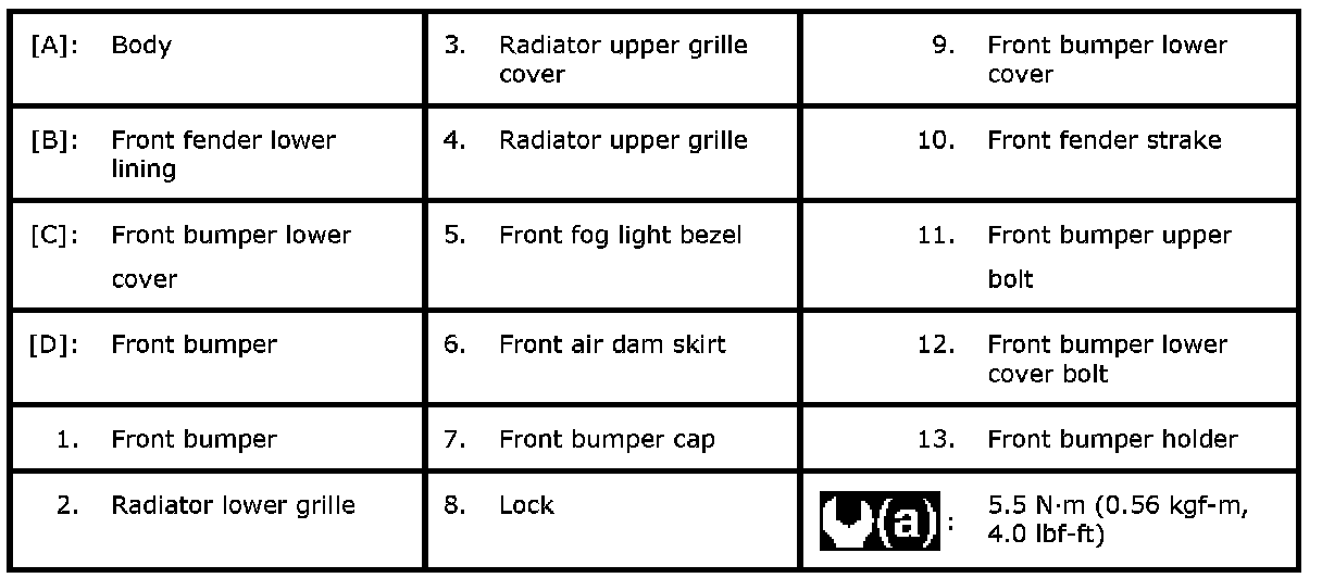 Front bumper lower cover bolt: 5.5 N.m (0.56 kg-m, 4.0 lbf-ft)