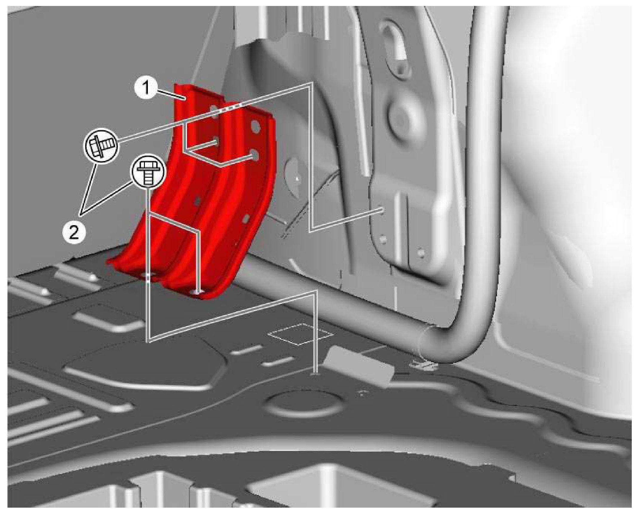 2. Remove rear floor side brace bolts (2) and remove rear floor side brace (1).