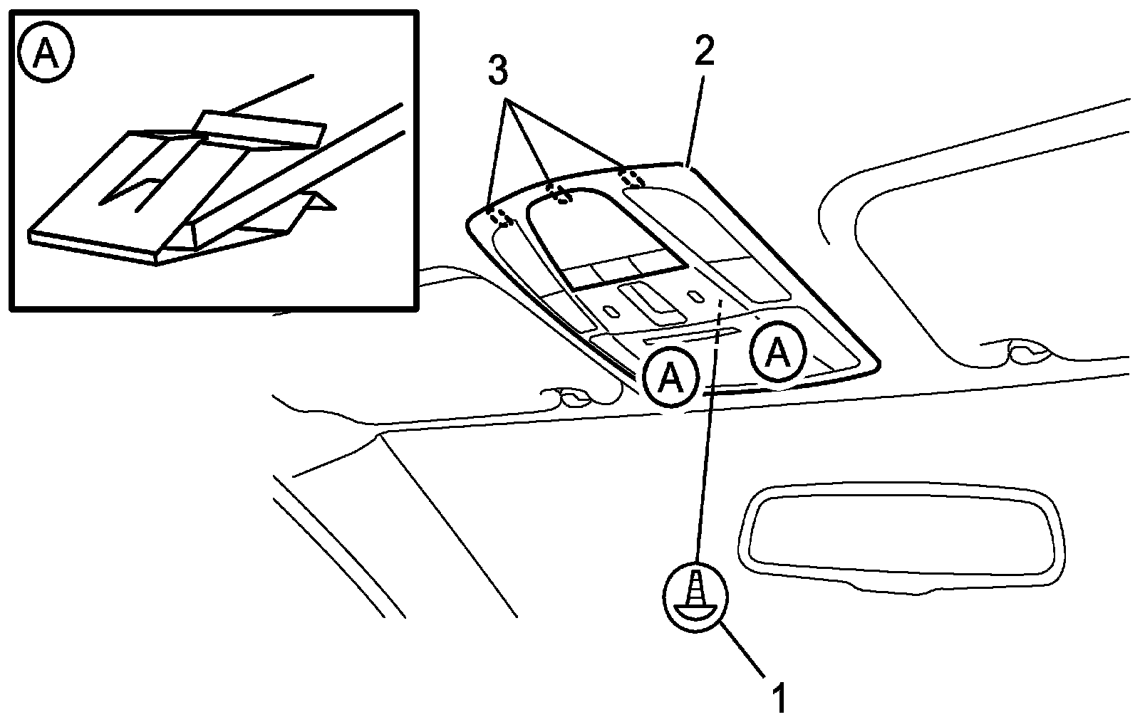 3. Release claws (3) from roof lining and remove overhead console box (2).