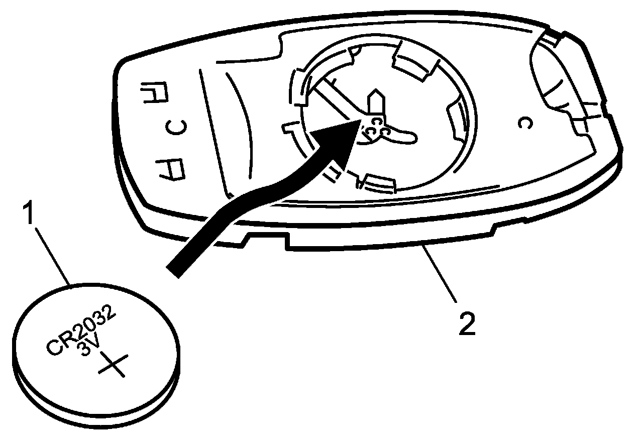 5. Place battery (lithium disc-type CR 2032 or equivalent) (1) so its "-" terminal faces "-" mark of the printed circuit board (2).