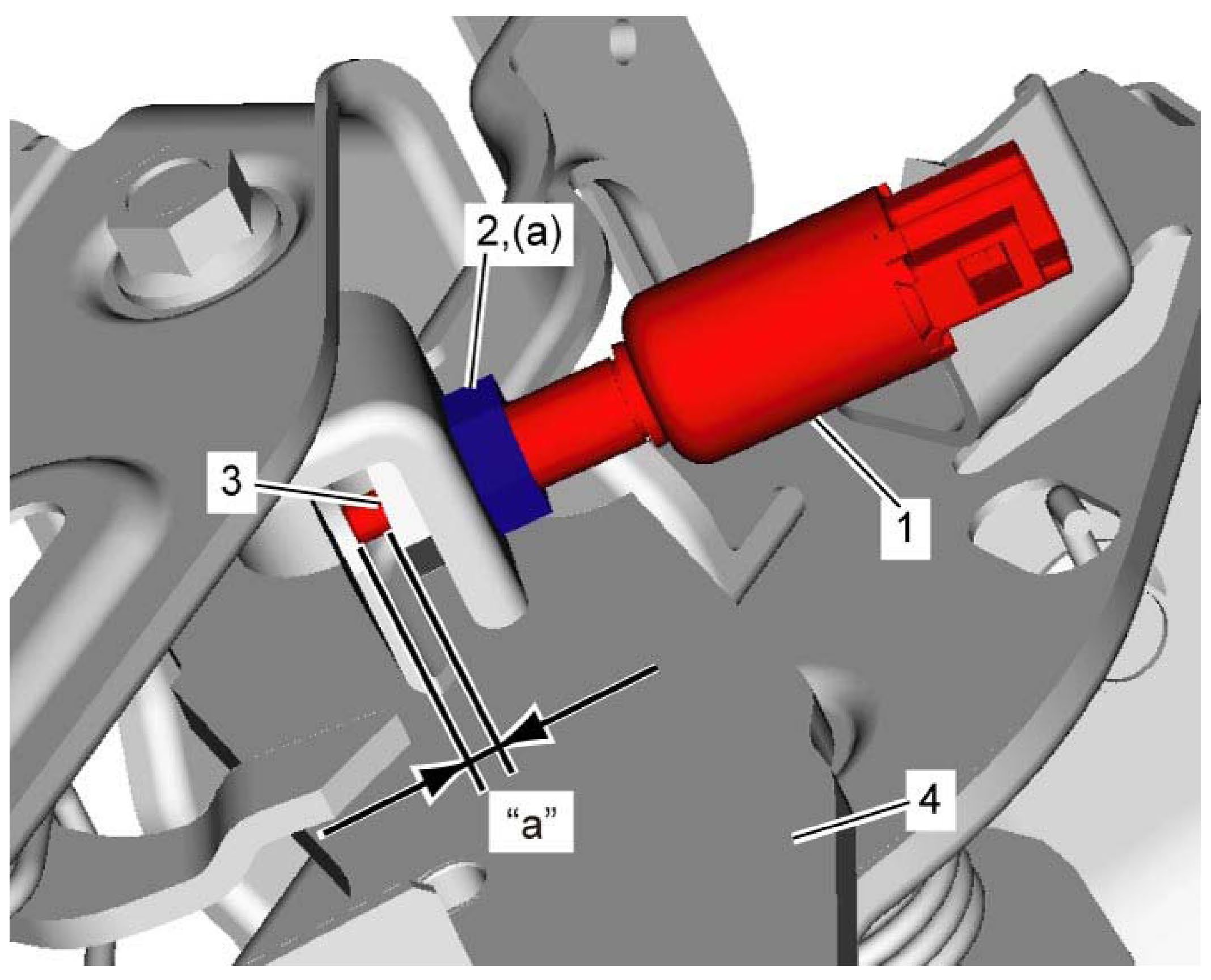 2. With clutch pedal (4) released, adjust switch position so that clearance between end (3) of thread and clutch pedal bracket is within specification.