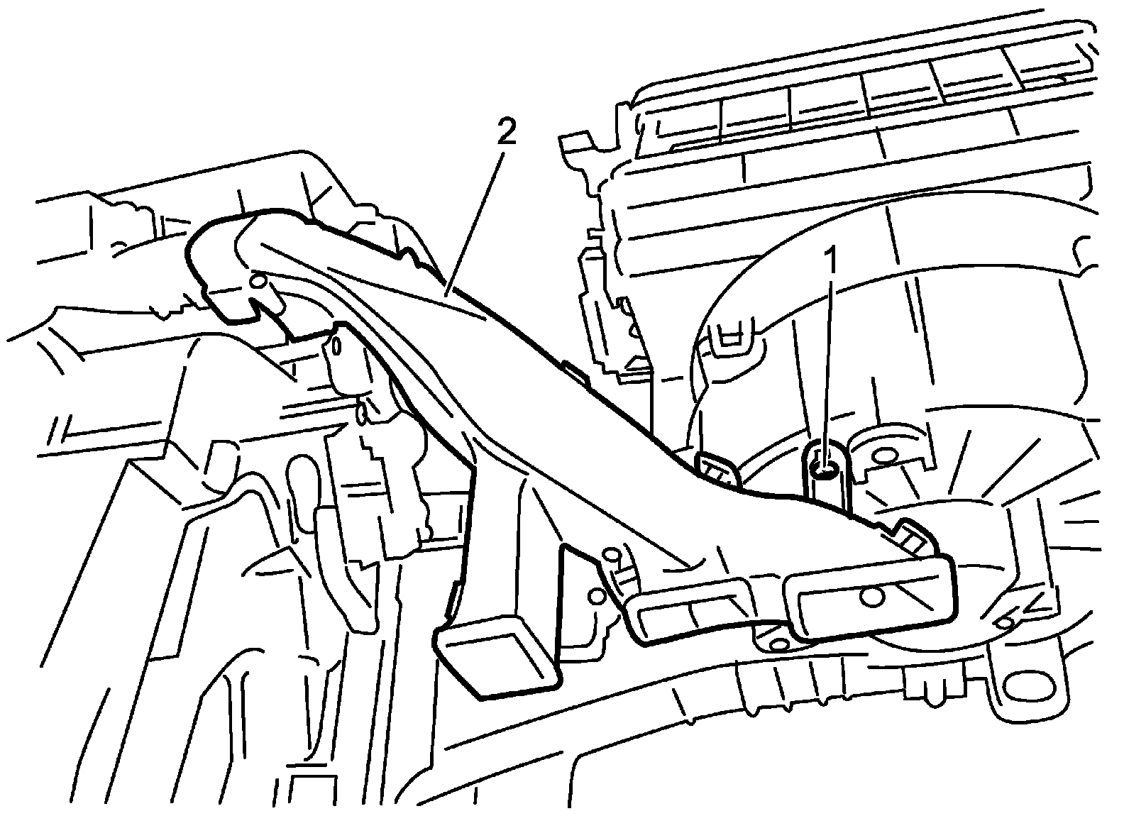 2. Remove a screw (1). Then remove passenger side foot duct (2) from HVAC unit.