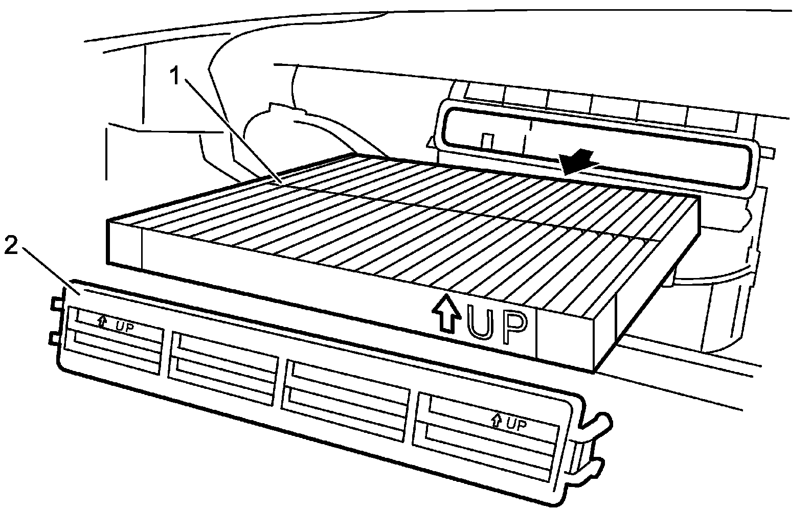 - Install HVAC air filter (1) and HVAC air filter holder (2) into HVAC unit noting the direction of arrow (3).