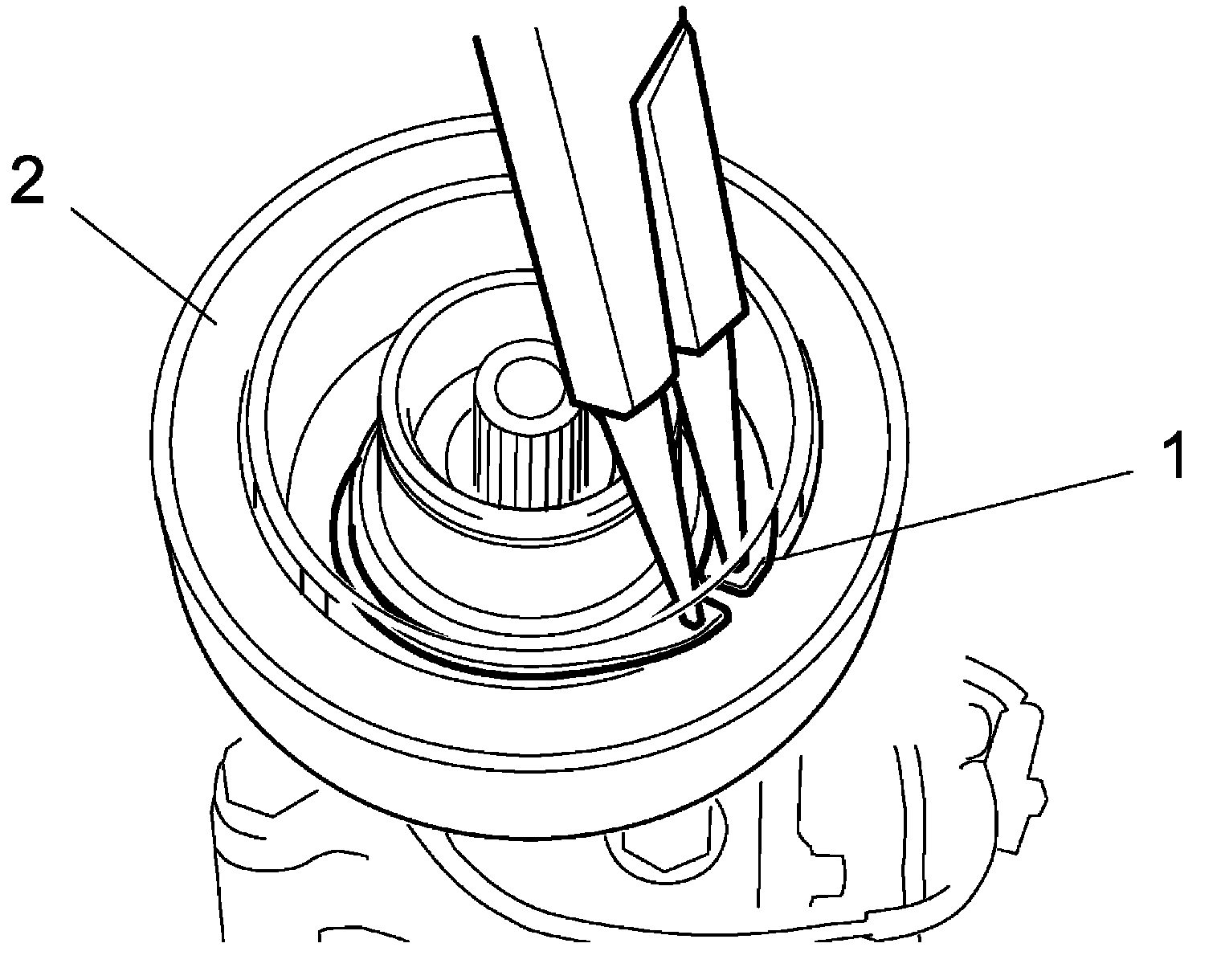 6. Remove snap ring (1) using (opening type) snap ring pliers, and then remove magnet clutch coil (2).