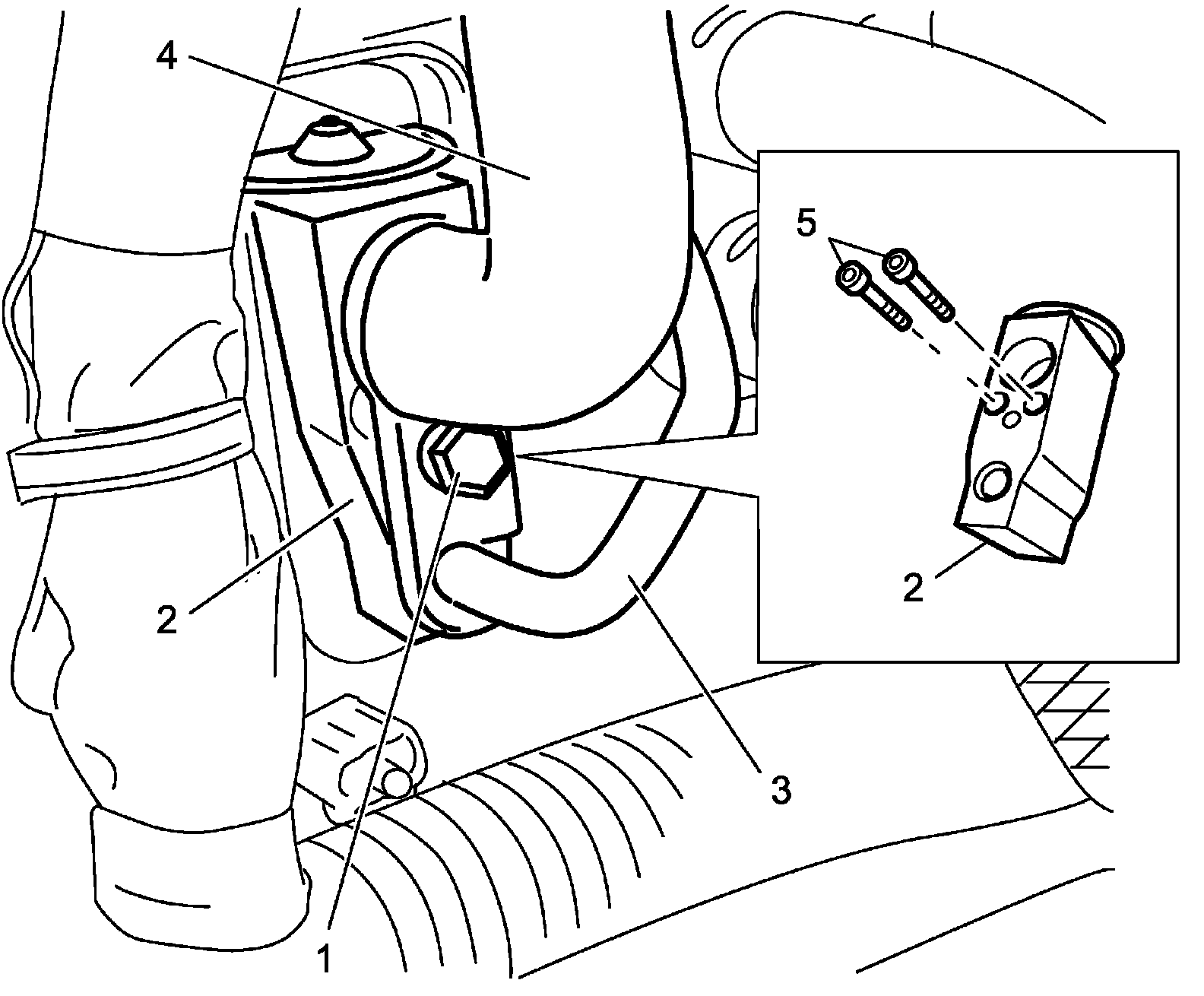 2. Remove liquid pipe bolt (1), and then remove liquid pipe (3) and suction hose (4) from expansion valve (2).