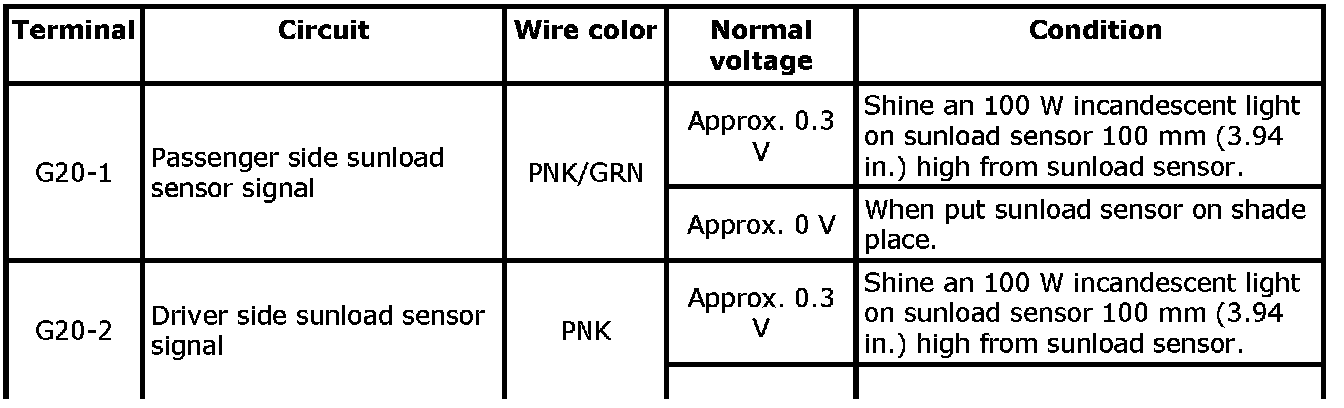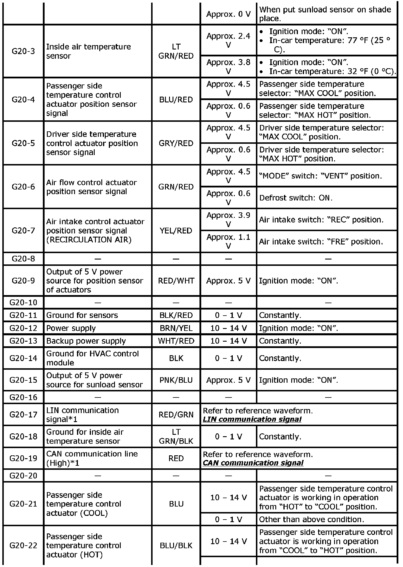 - Normal voltage of circuits with asterisk (*2) are reference values corresponding to when control puts the temperature control actuator at max cool position, air flow control actuator at "VENT" position, air intake control actuator at "REC" position and battery voltage is approx. 12 V.