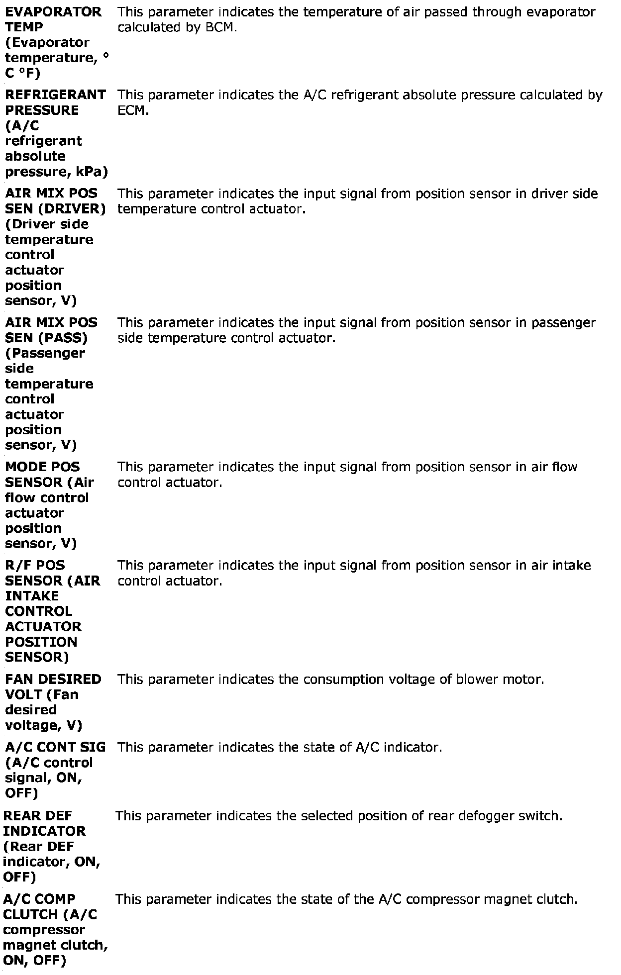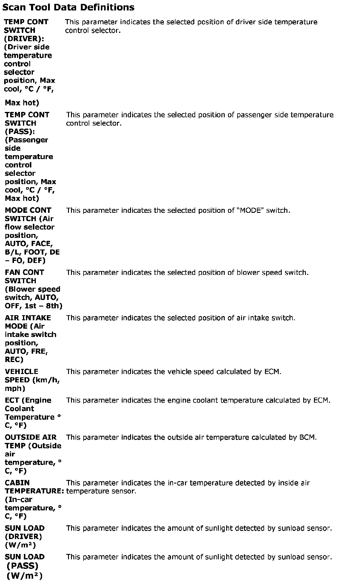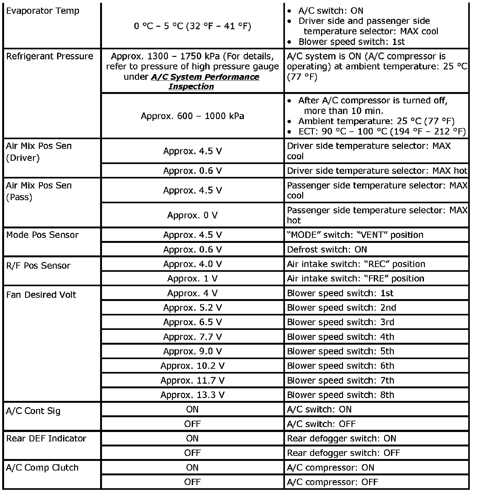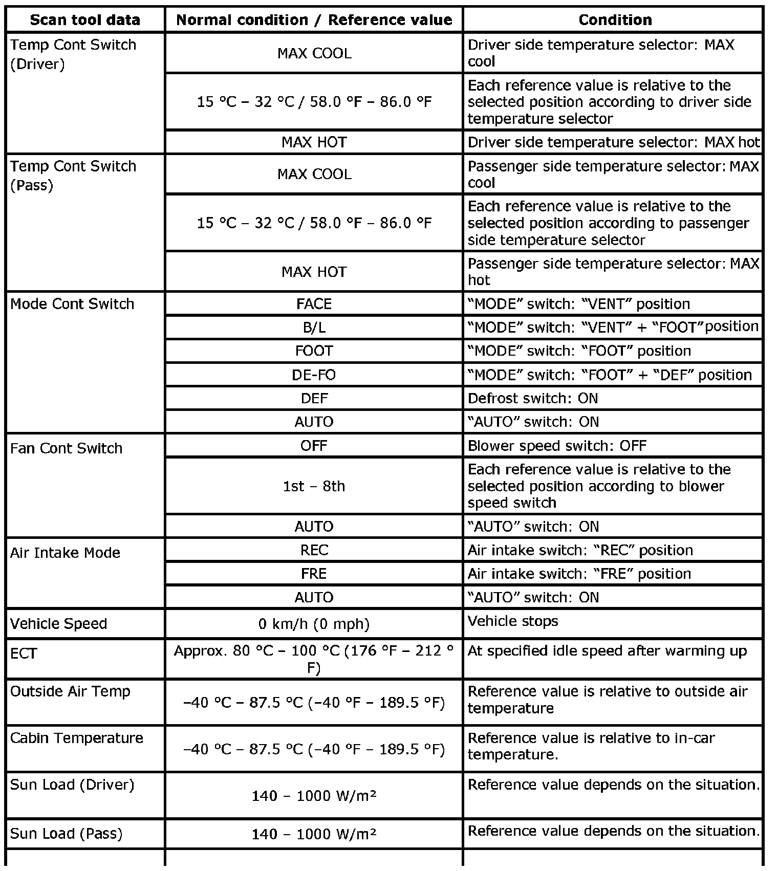 As the data shown in the following table are standard values of normal operation vehicle measured by SUZUKI scan tool, use them for reference. Even if a vehicle is in good condition, there may be cases where the measured values do not fall within the standard range depending on the condition. Therefore, judgment as abnormal should not be made by checking just with this data.