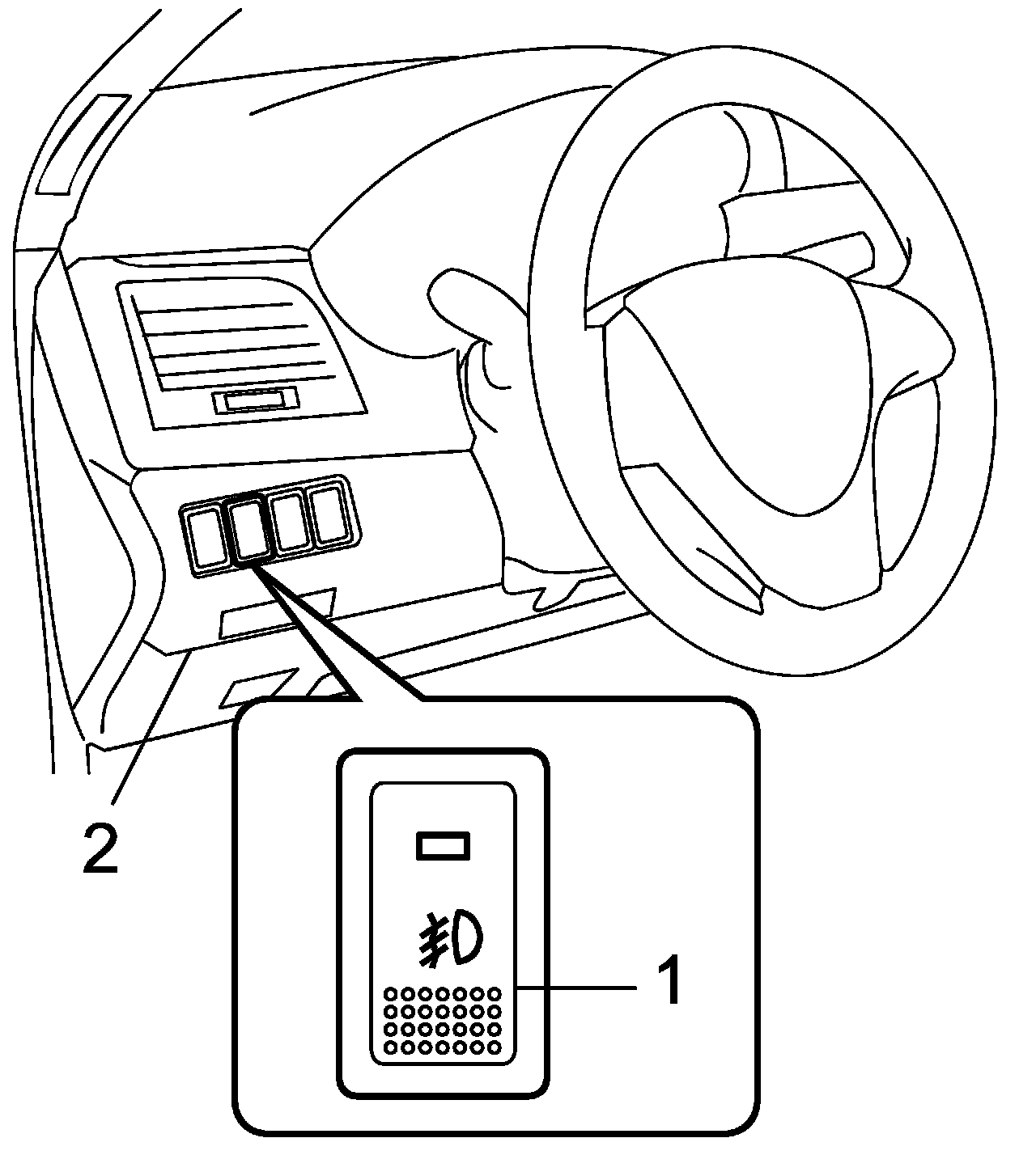 3. Remove fog light switch (1) from instrument panel switch bezel (2).