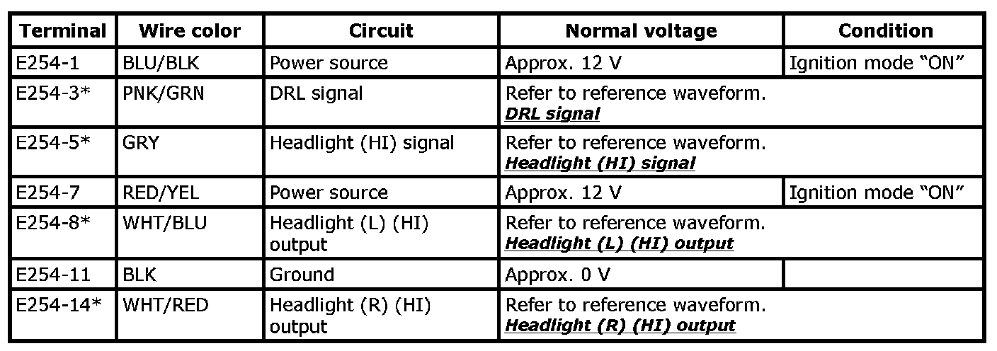 - Outputs from terminals marked with asterisk (*) cannot be measured with voltmeter because they are pulse signals. Use oscilloscope function of SUZUKI scan tool for measuring these outputs.