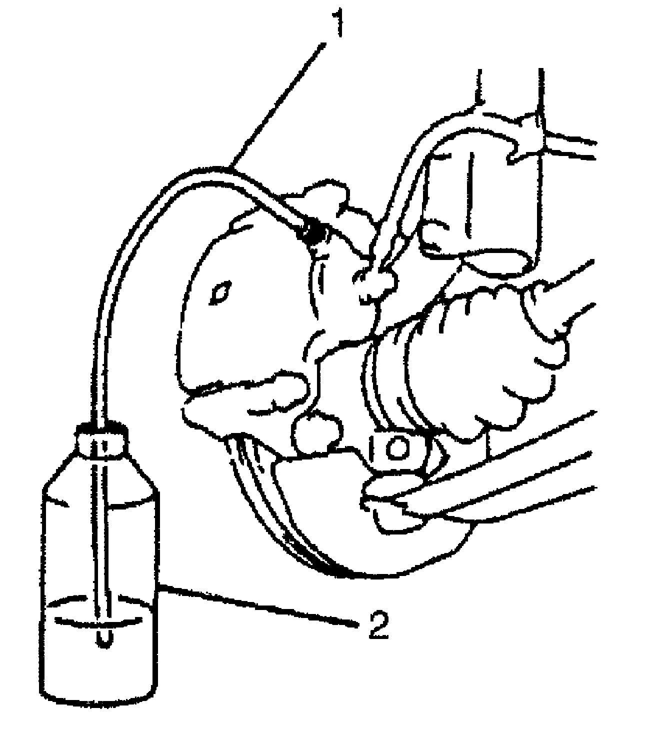 3) Remove bleeder plug cap on brake caliper. Attach a vinyl tube (1) to bleeder plug, and insert the other end into container (2).