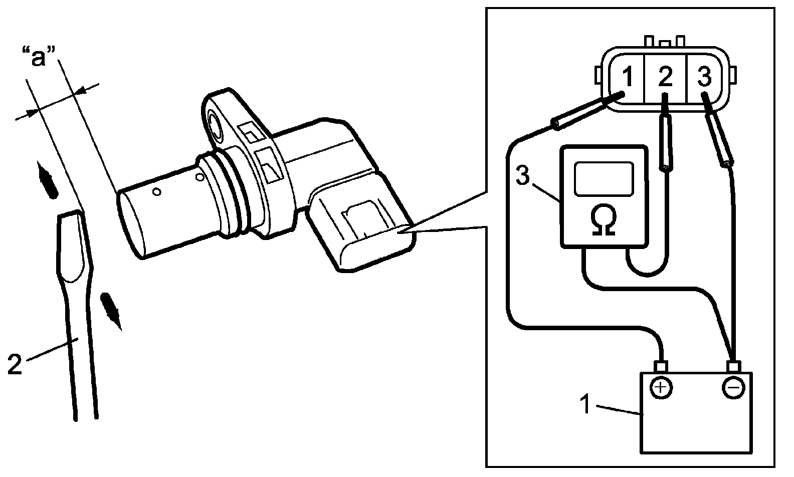 a. Connect battery (1) and ohmmeter (3) to CMP sensor as shown in figure.