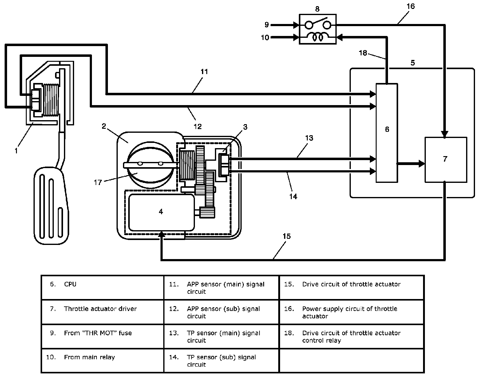 In this system, TP sensor and APP sensor have 2 sensors (main and sub) each to assure highly accurate and highly reliable control and abnormality detection. Also, when ECM detects an abnormality in the system, it turns off the throttle actuator control relay (8) to stop controlling the throttle actuator. When the throttle actuator control relay is turned off, the throttle valve is fixed at the opening of about 7° (default opening) from its completely closed position by the balance of the return spring and open spring in the throttle body.