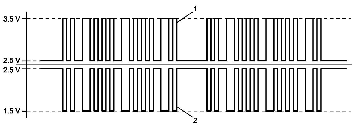 CAN communication system is a serial communication system for transmitting multiple data items (values from sensors, control data and control signals) as ON-OFF digital signals through communication lines. This system uses two lines (CAN High and CAN Low) for the communication circuit so as to maintain high reliability even when used for high-speed serial communication. Serial communication is established as shown below with 2.5 V as the reference level for both CAN High signal (1) and CAN Low signal (2). The range of CAN High signal is from 2.5 V to about 3.5 V and that of CAN Low signal is from 2.5 V to about 1.5 V. When both are at 2.5 V, signal is judged as OFF. When CAN High signal is 3.5 V and CAN Low signal is 1.5 V (that is, when the difference between High voltage and Low voltage is more than about 2 V), signal is judged as ON. For this reason, a feature of CAN communication signal is that the signal waveform between CAN High and CAN Low signals is symmetrical with respect to 2.5 V level. CAN communication fails when the symmetrical signal form collapses.