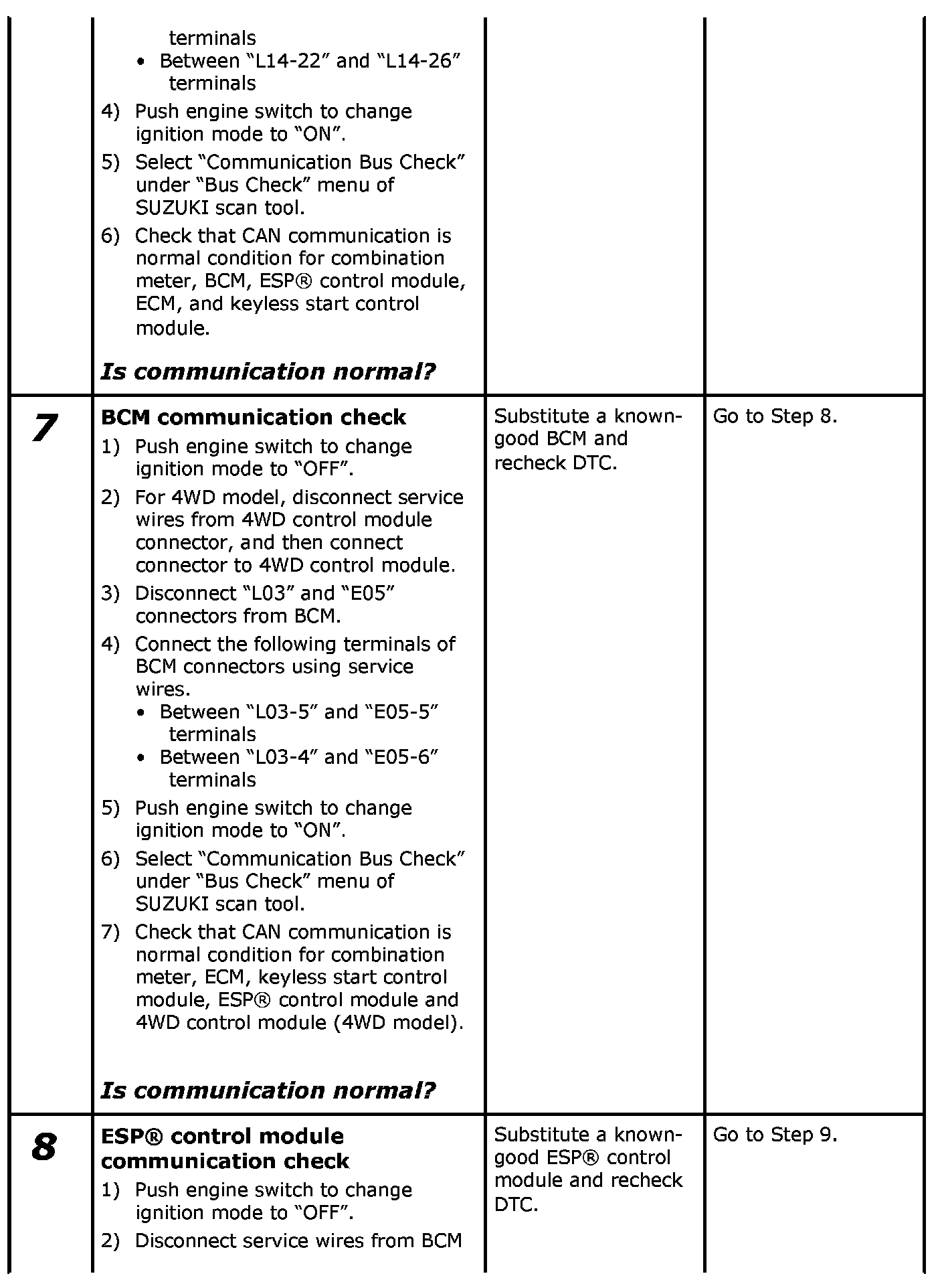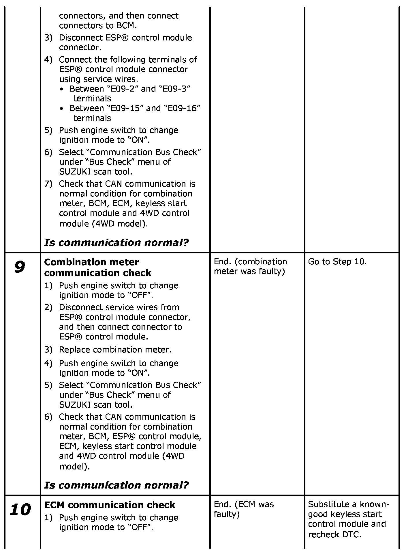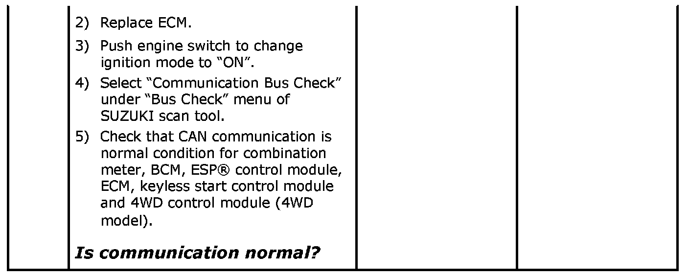 When performing "Communication Bus Check" by using SUZUKI scan tool, refer to the following table for judgment.