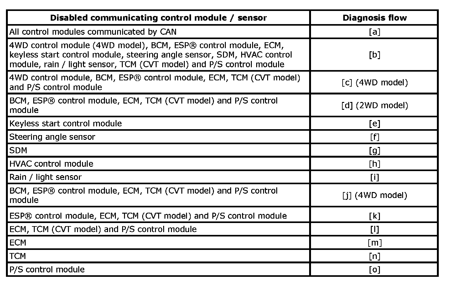 - Diagnosis flows [a] to [o] link with CAN communication lines [a] to [o] of CAN Communication System Circuit Diagram.