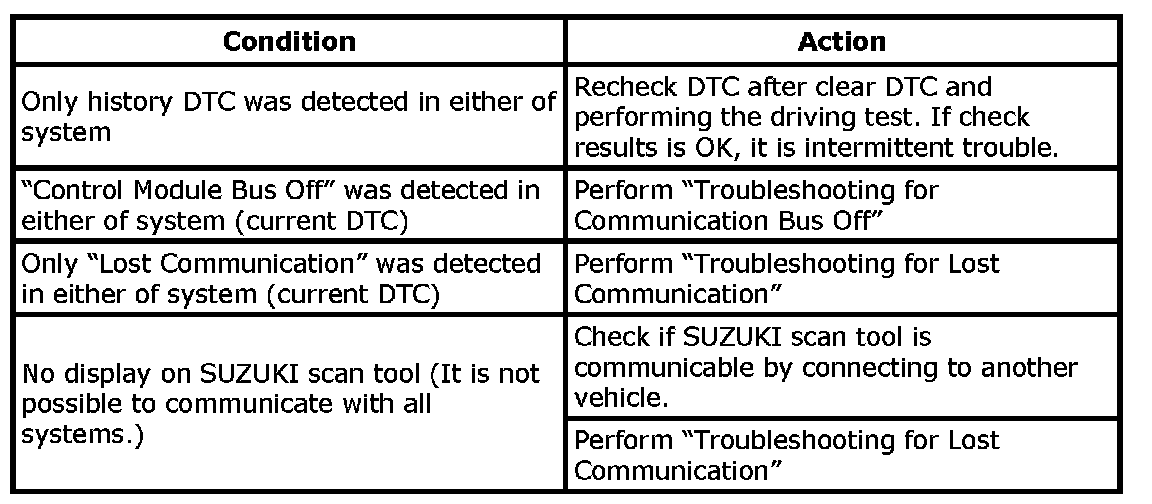 Using SUZUKI scan tool, execute "Communication Malfunction DTC" under "Bus check" and check DTCs of all control modules connected to CAN Communication Bus.