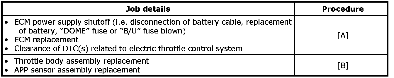 Electric Throttle Control System Calibration1. It is necessary to perform calibration when carrying out any of the "job details" listed below. The calibration procedures differ depending on the job being carried out. Select the proper calibration procedure from the table below, and then perform calibration.