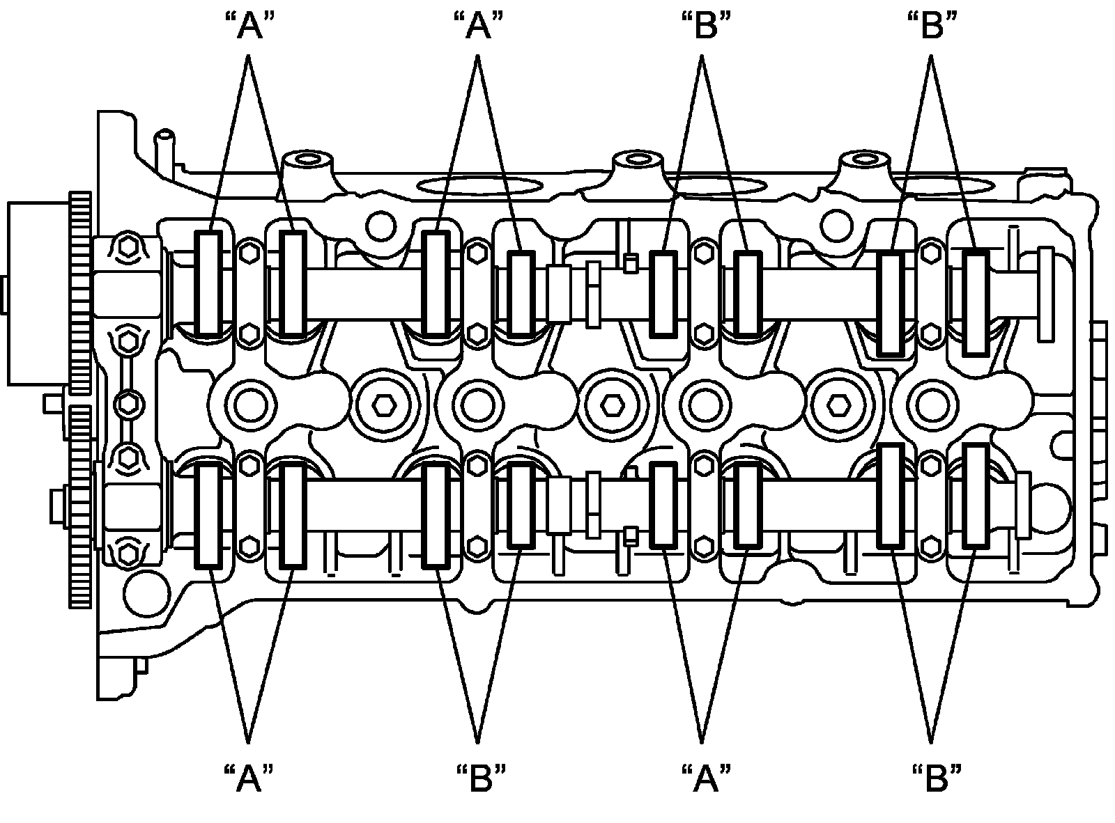 a) Measure valve clearances of "A" valves as indicated in the following figure.