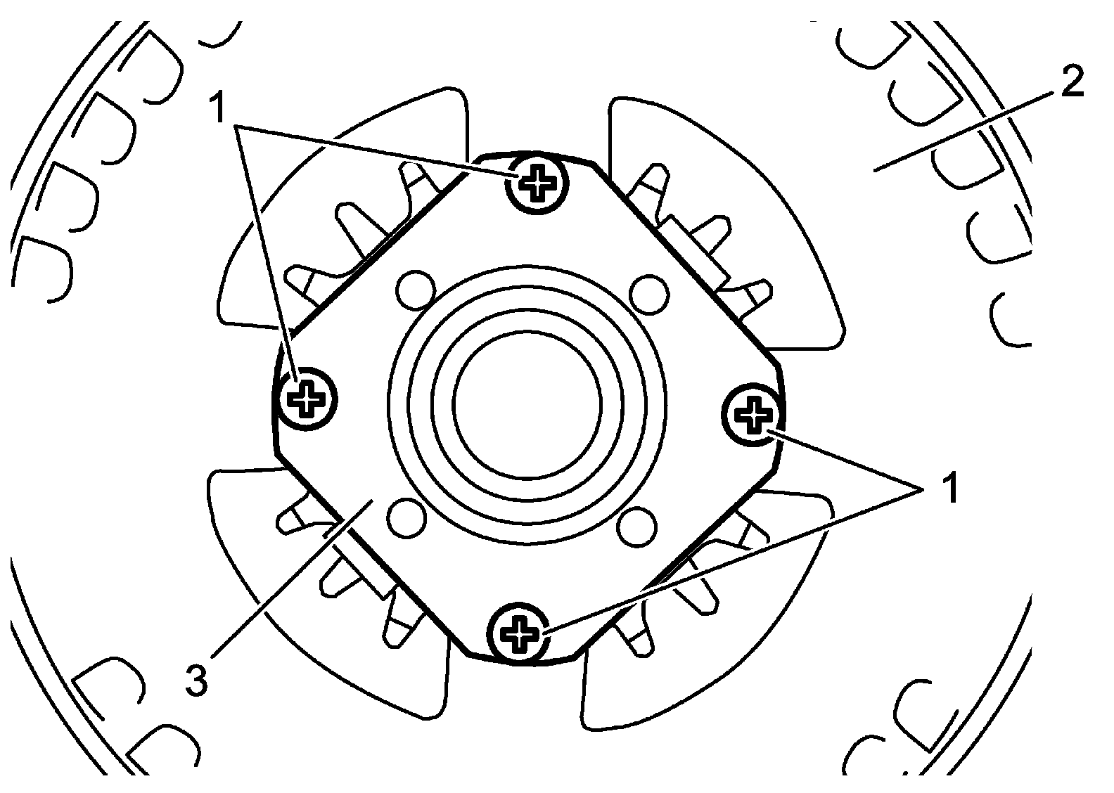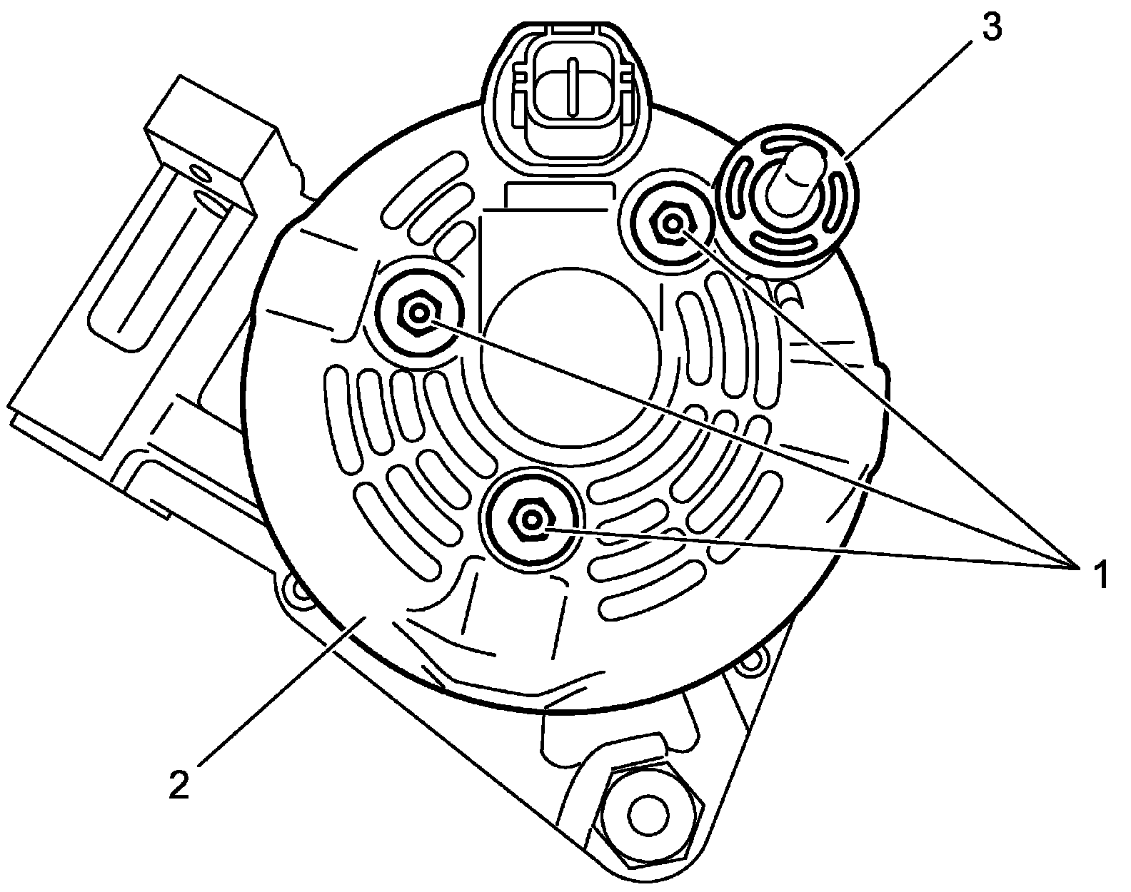 b. Install brush holder assembly (1) to stator assembly (2) and tighten brush holder screws (3) to specified torque.