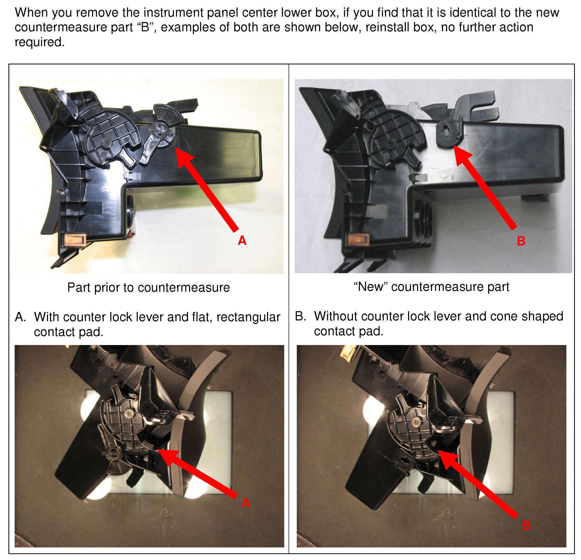 When you remove the instrument panel center lower box, if you find that it is identical to the new countermeasure part "B", examples of both are shown below, reinstall box, no further action required.