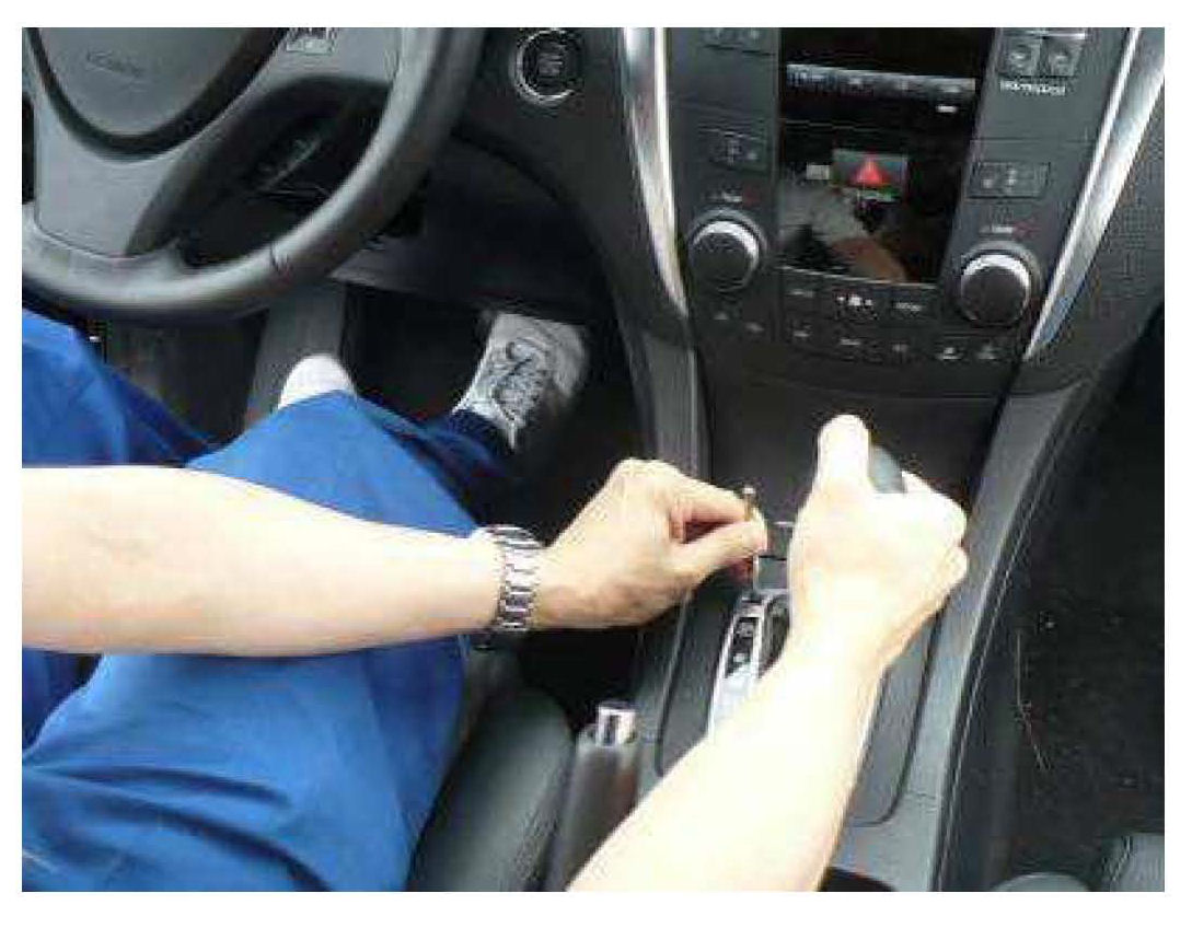 5. Using the micro flat-blade (pocket) screwdriver with the tip wrapped with vinyl tape, remove the cap from the shifter garnish covering the "manual" shift interlock mechanism.