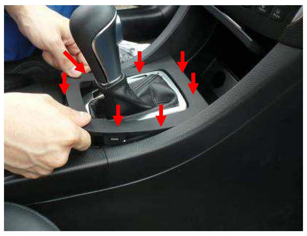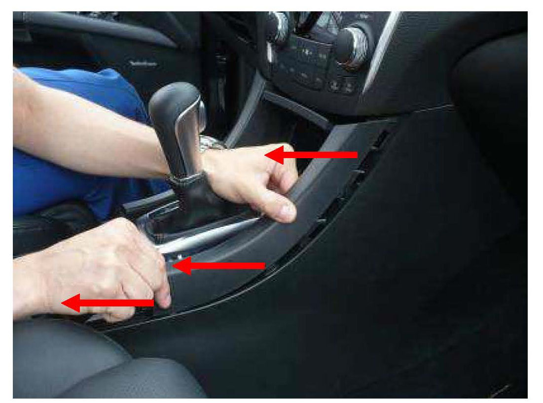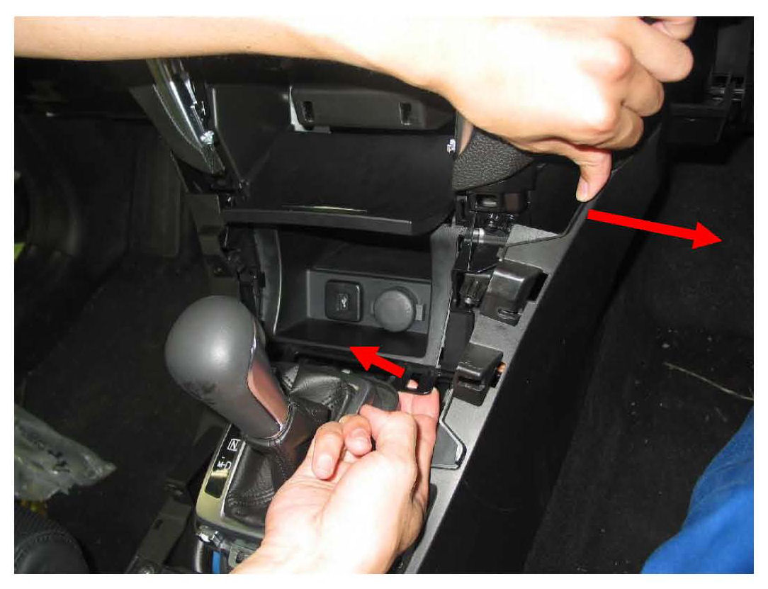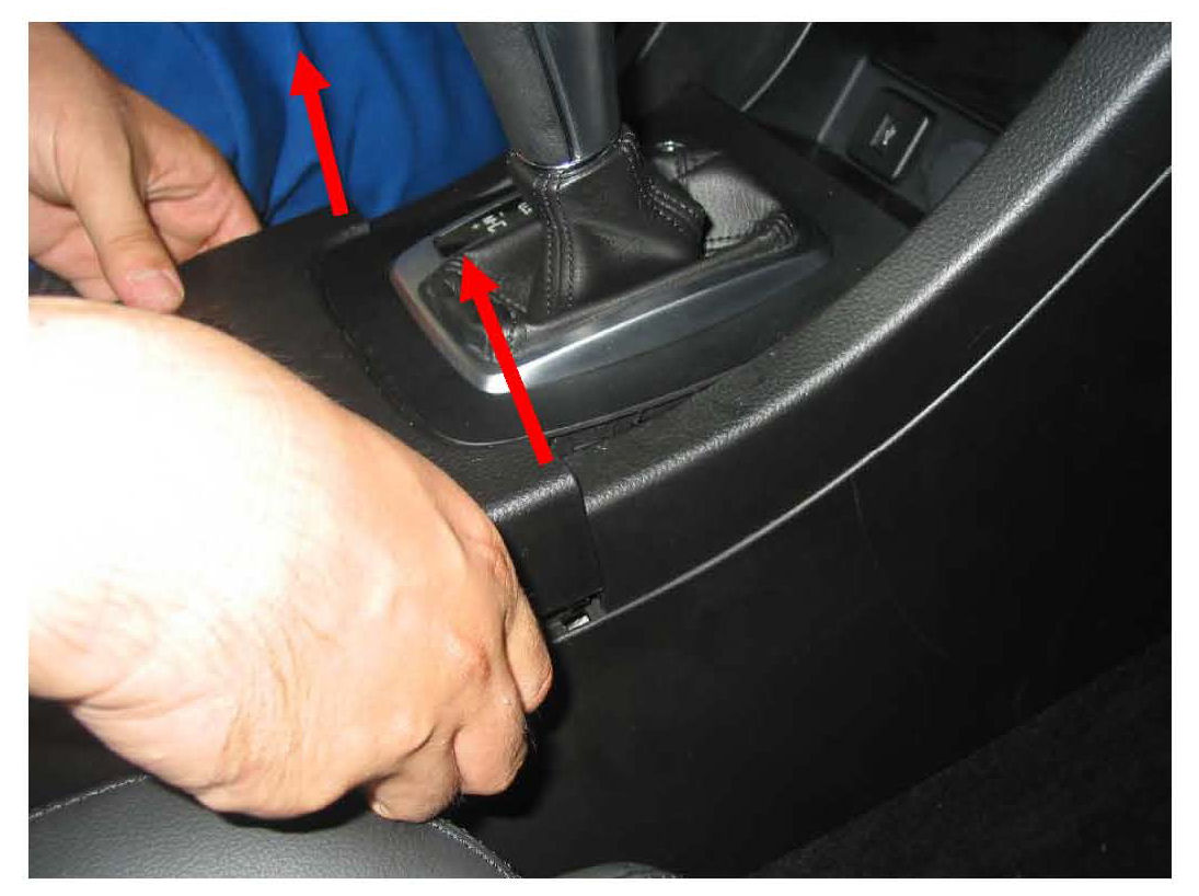 8. Lifting up the front edge of the console rear panel, lift up the rear edge of the black gearshift garnish.