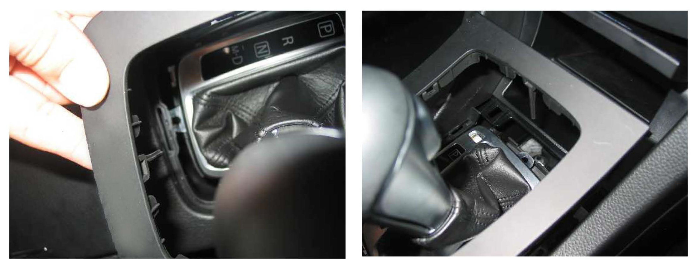 9. There are seven (7) retaining claws that secure the gearshift garnish. These are disengaged in four stages beginning at the rear and moving forward. To disengage the front two points, apply pressure on the garnish pulling slightly back while lifting.