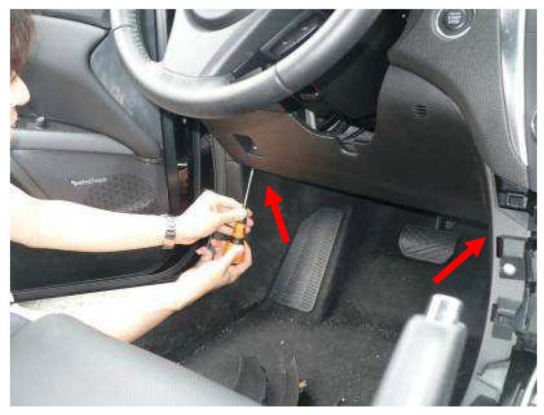 17. Remove the two (2) screws and one (1) clip of the right floor console front panel.