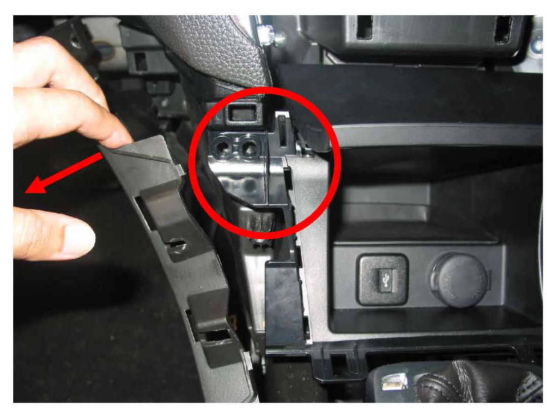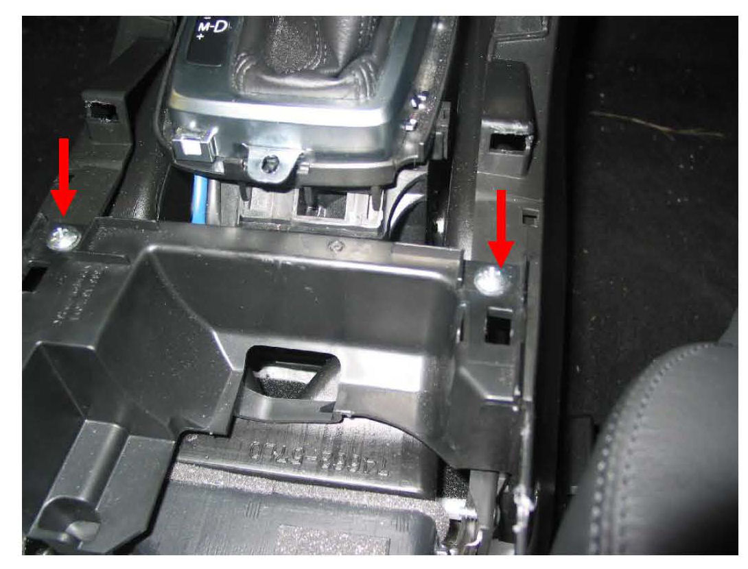 21. While pulling the floor console front panel outward, remove the screw from the center lower box, one each behind the left and right panels.