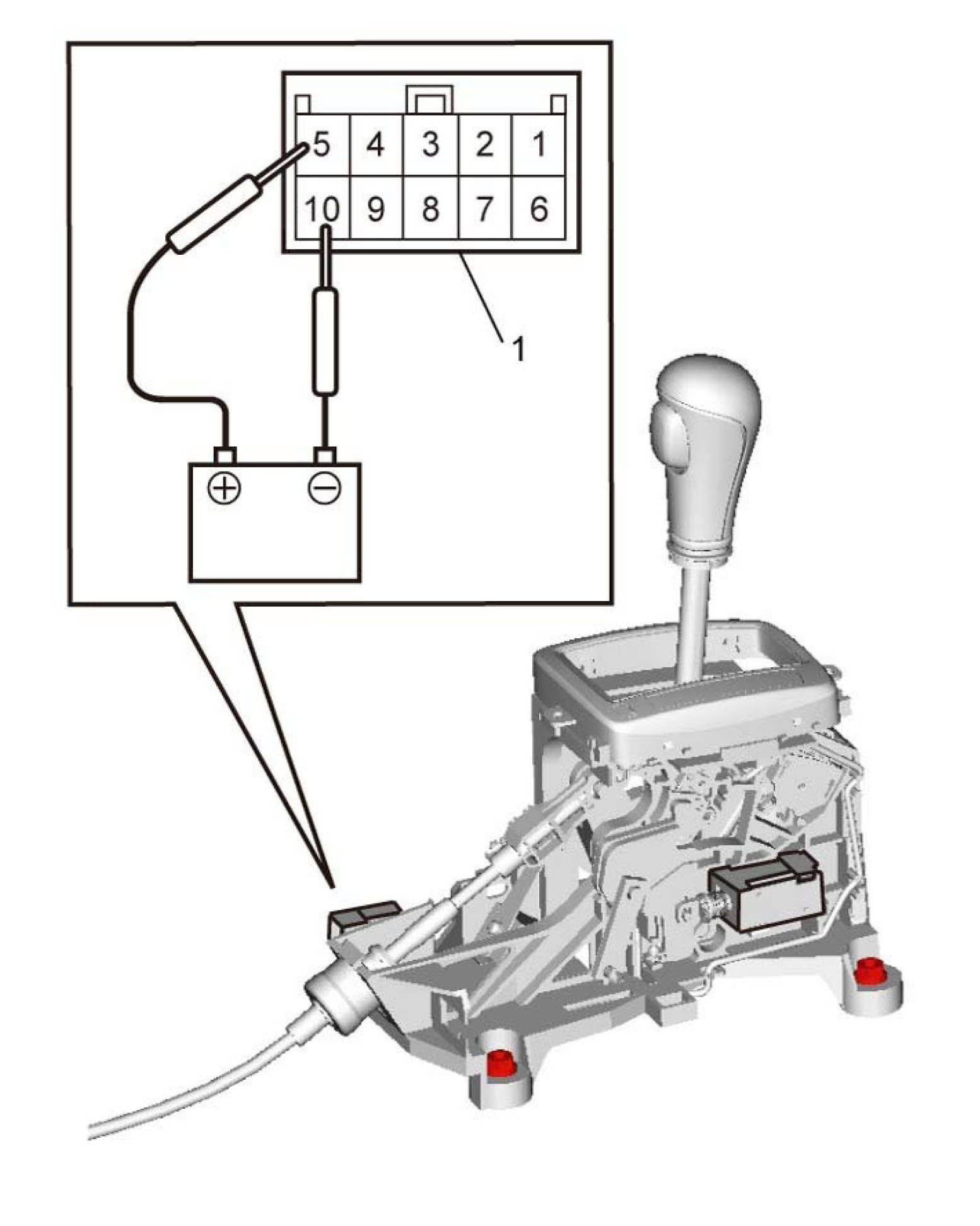 3) Check that shift lock solenoid rod moves smoothly and returns when positive terminal of battery is connected to terminal "5" and negative terminal of battery is connected to terminal "10".