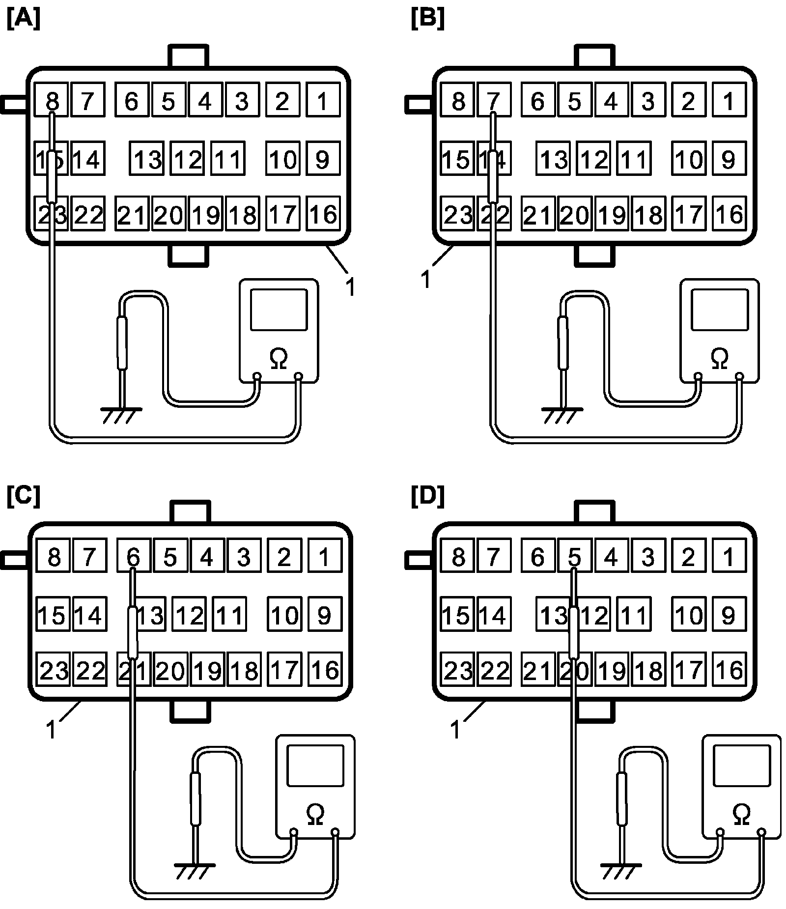 Between Lock-up / select switching solenoid valve terminal "5" and CVT case: 17 - 38 ohms at 20° C (68° F)