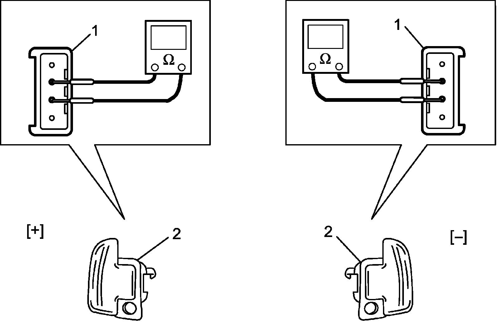 Check for continuity between terminals of shift paddle switch connectors (1). Replace steering wheel assembly if check result is not as specified.