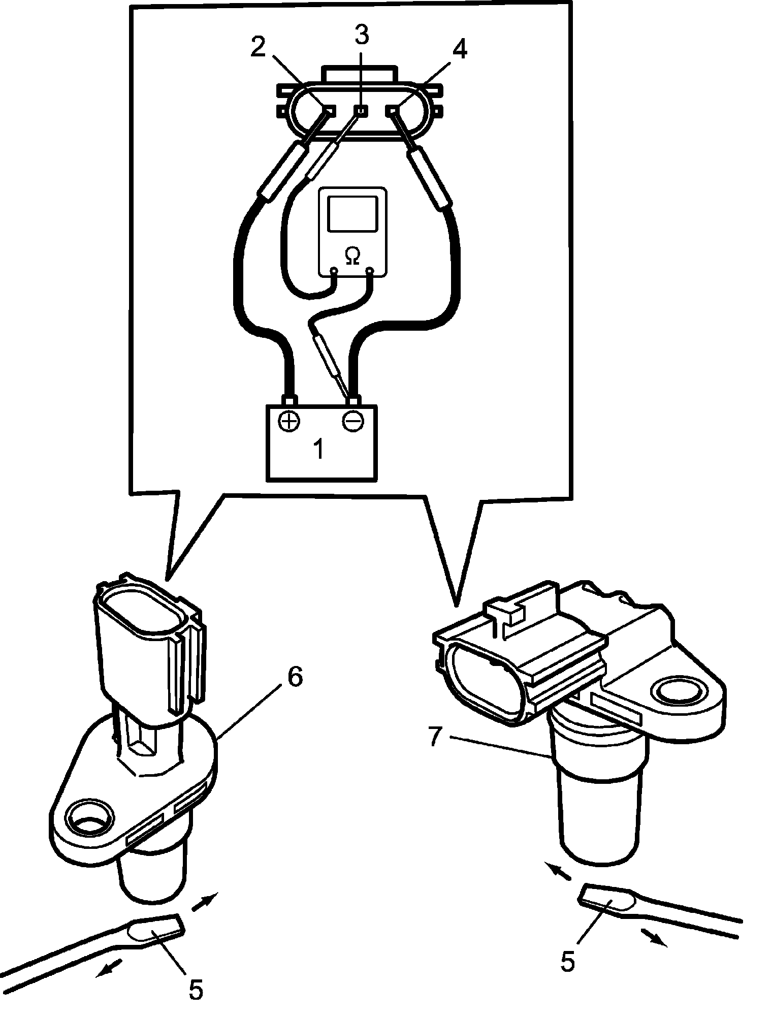 b) Use ohmmeter to measure resistance between terminal "3" (3) of sensor connector and negative terminal of battery by passing flat-end screwdriver or the like (5) between them while maintaining an approximately 1 mm (0.03 in) gap with respect to end face of primary pulley speed sensor (6) or secondary pulley speed sensor (7).