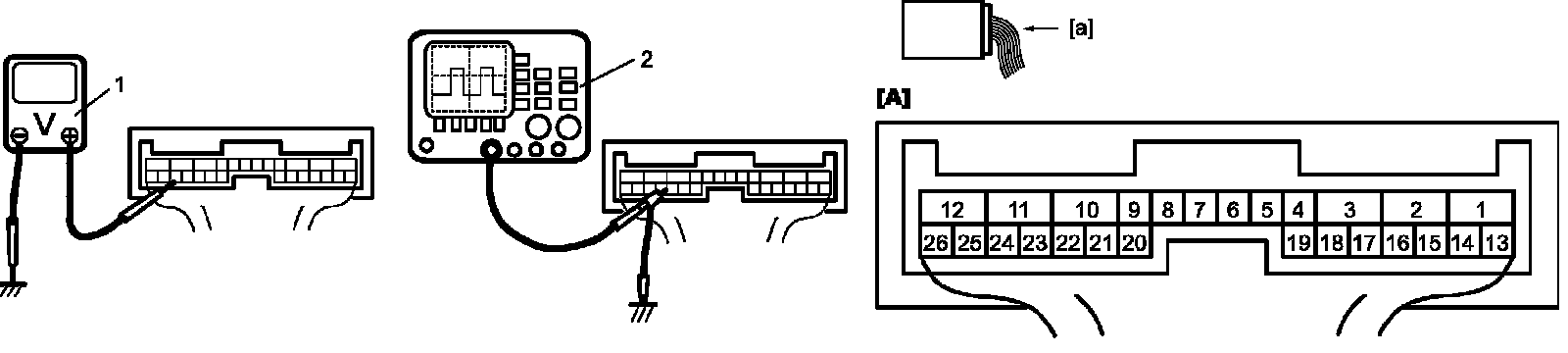 2) Check voltage and/or pulse signal at each terminal of connectors using voltmeter (1) and oscilloscope (2).