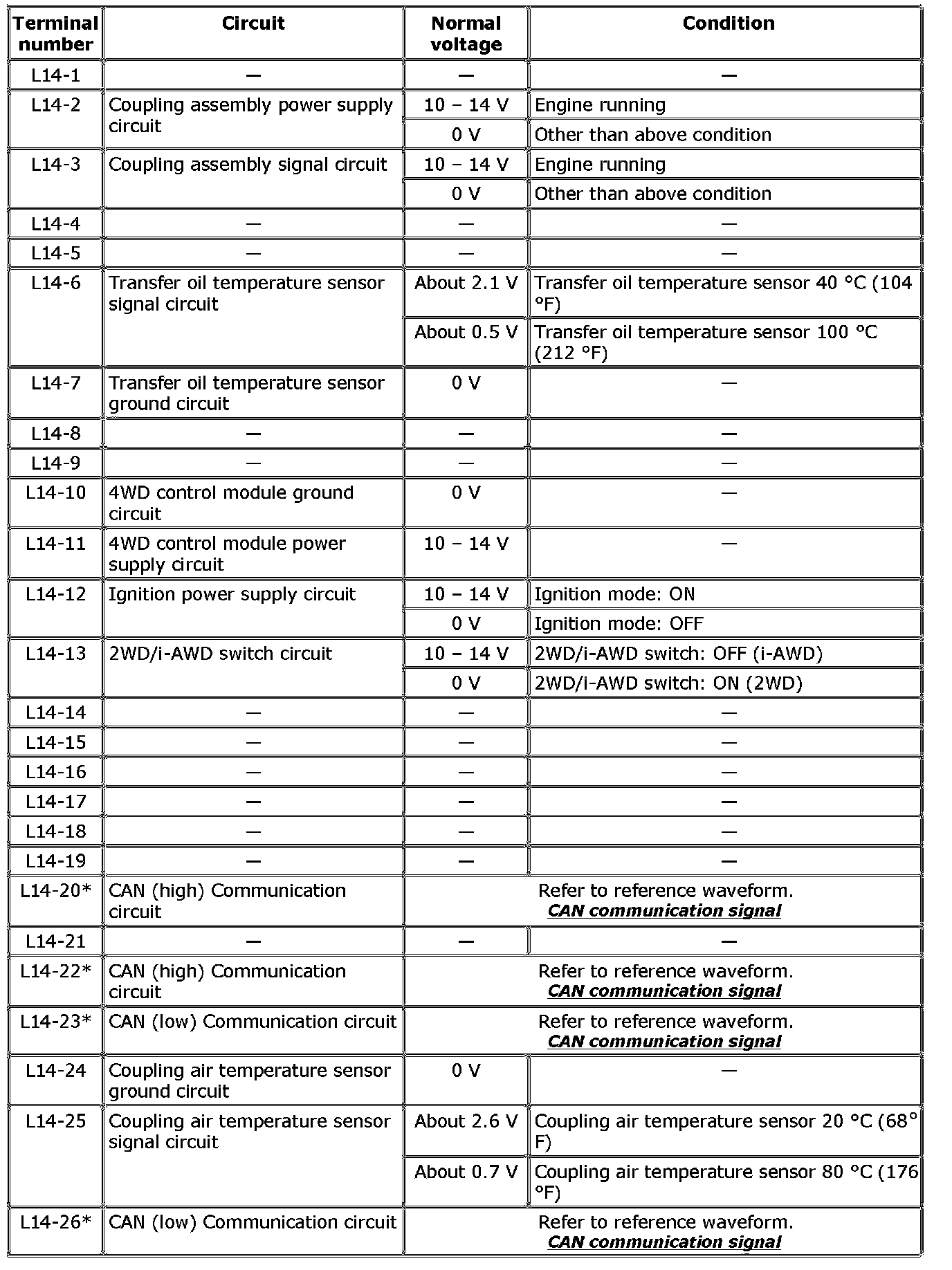 Inspection of 4WD Control Module and Its Circuits4WD control module and its circuits can be checked by measuring voltage and pulse signal at connector connected to 4WD control module.