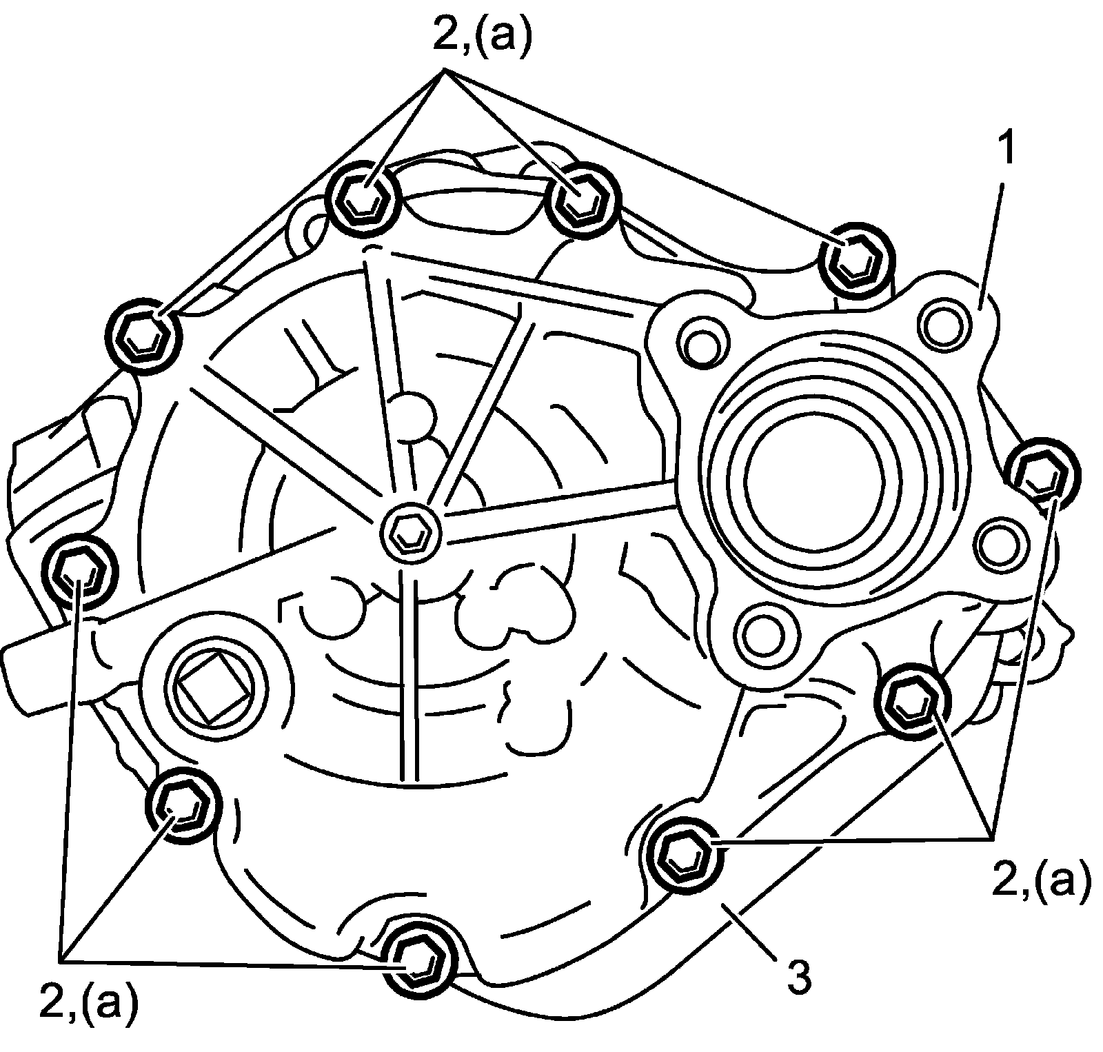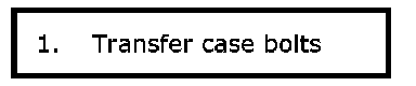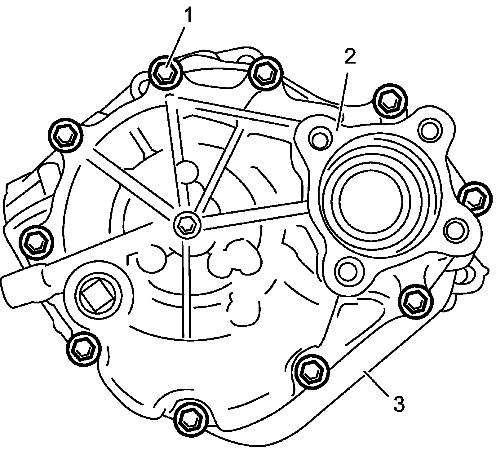 17) Install transfer right case (1) to transfer left case (3) and tighten transfer case bolts (2) to specified torque.