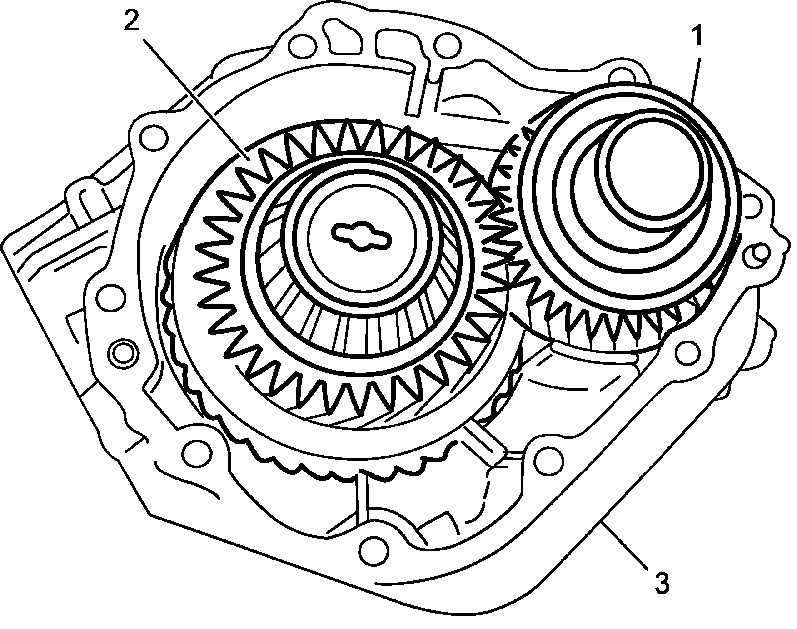 15) Install reduction drive gear assembly (1) and reduction driven gear assembly (2) to transfer left case (3).