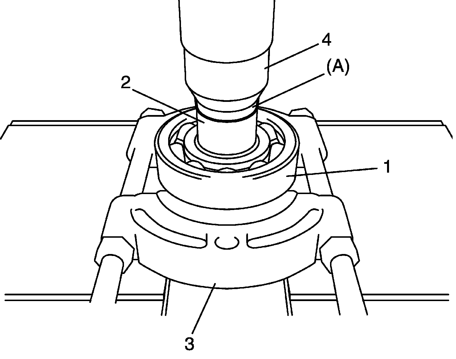 6) Use special tool, bearing puller (3) and hydraulic press (4) to remove both sides of bearings (1).
