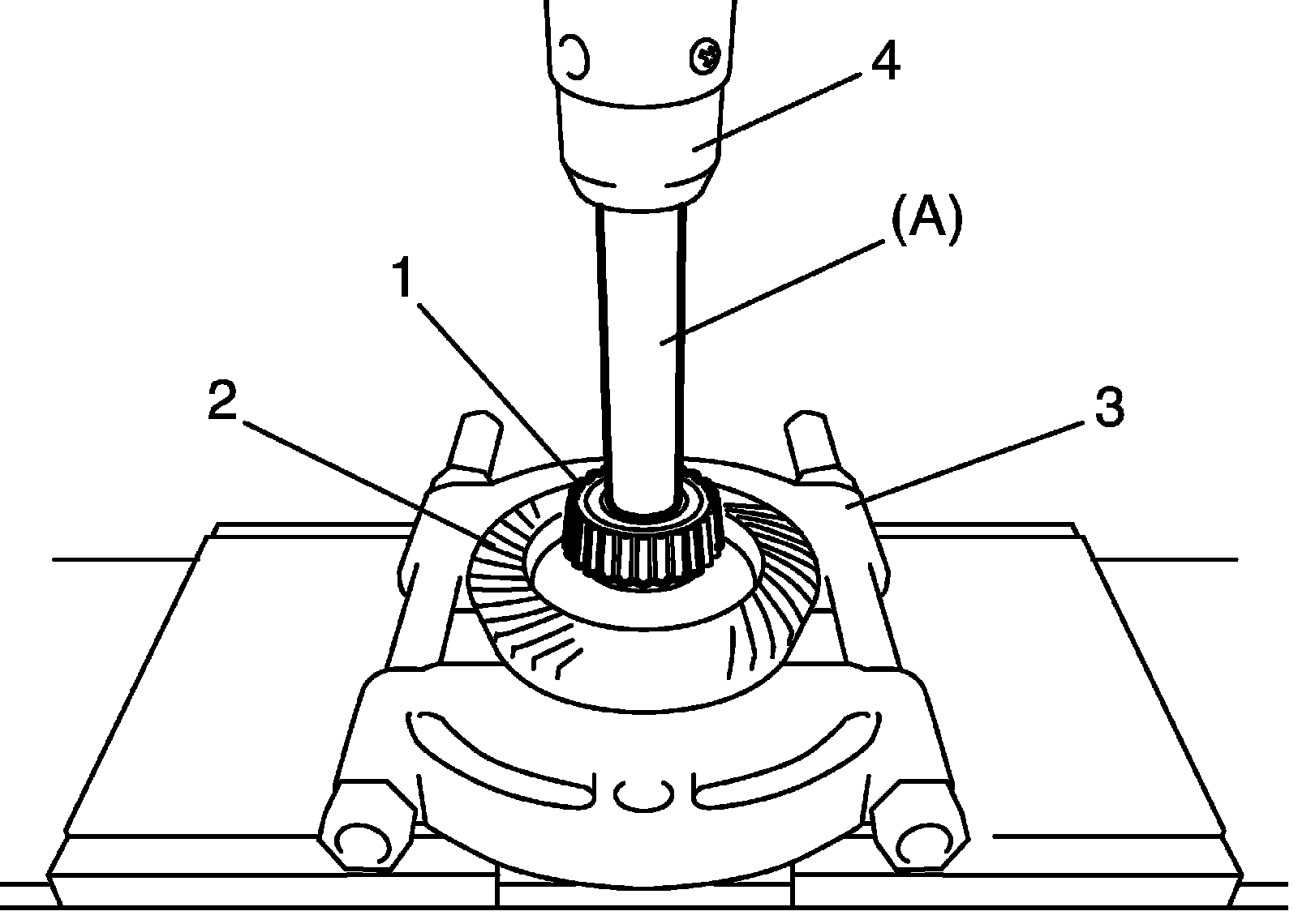 7) Use special tool, bearing puller (3) and hydraulic press (4) to remove left bearing (1) and bevel gear (2) from reduction driven gear.