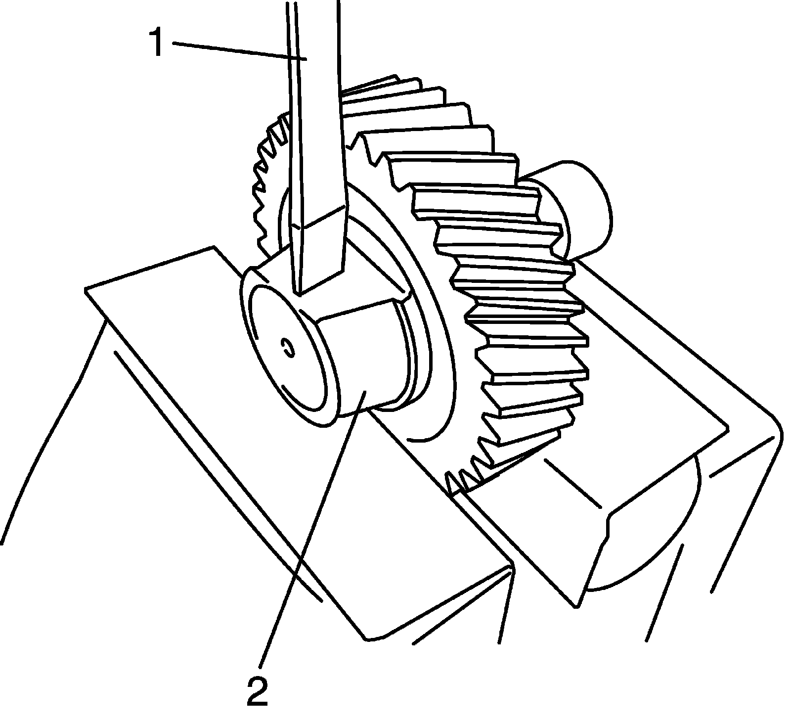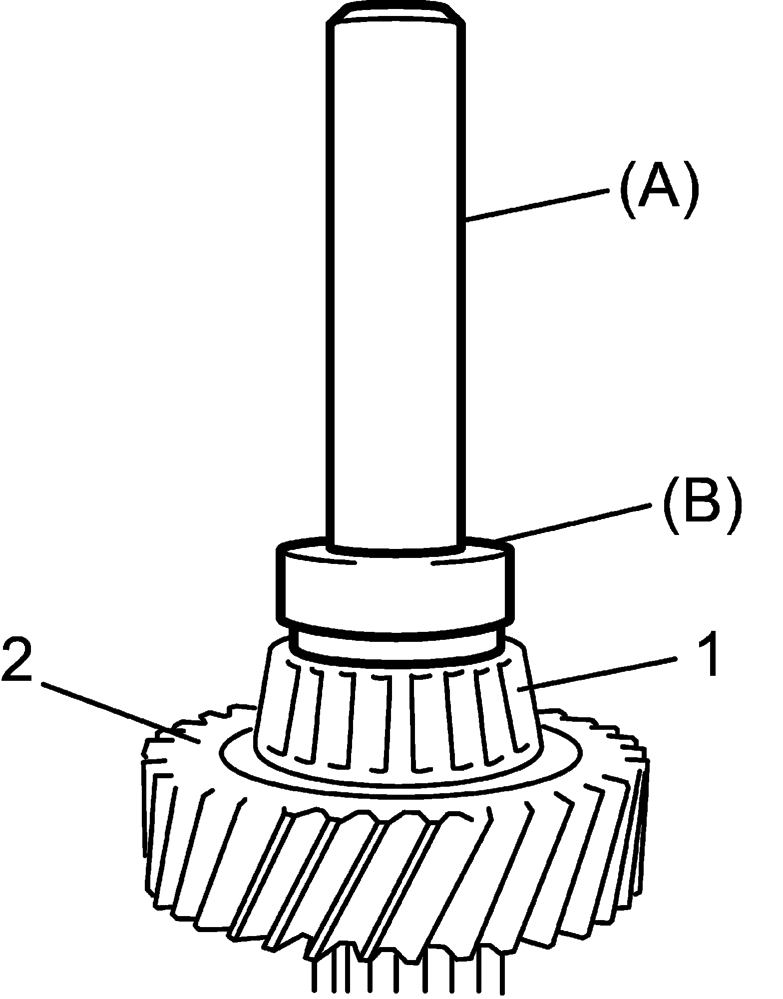 10) Use special tools and hydraulic press to install bevel gear (1) to reduction driven gear (2).