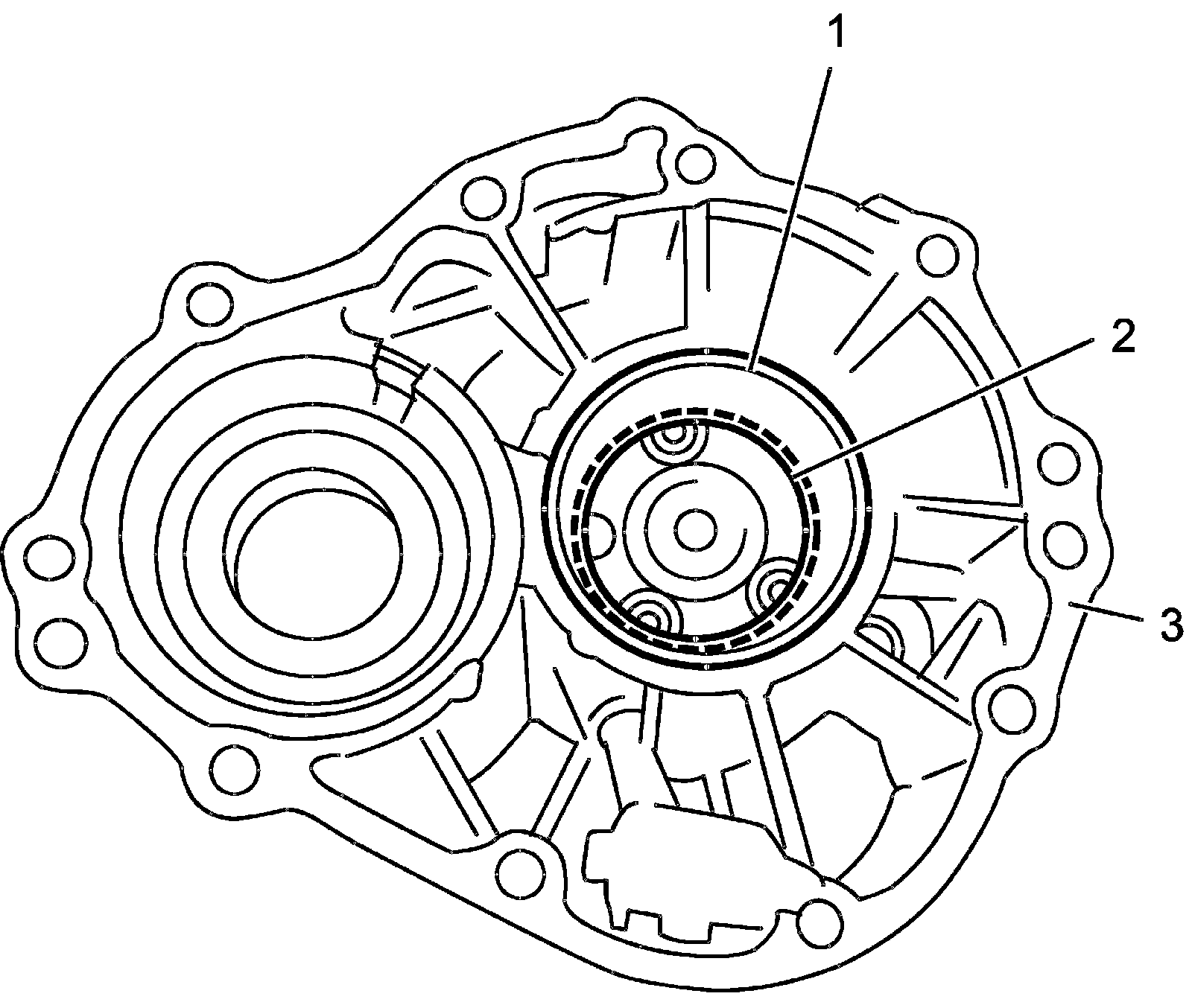 10) Remove bearing outer race (1) and shim (2) from transfer left case (3).
